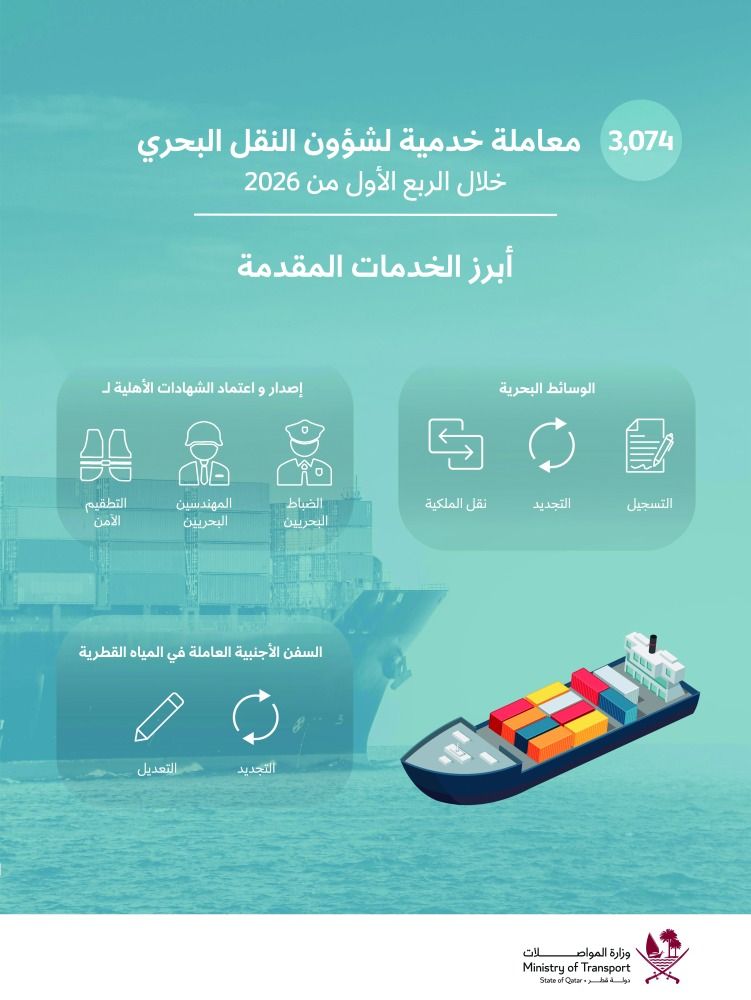 أعلنت وزارة المواصلات عن إنجاز 3,074 معاملة خدمية أنجزتها شؤون النقل البحري خلال الربع الأول من 2026 على حسابها الرسمي على منصة اكس، حيث تضمنت أبرز الخدمات المقدمة للوسائط البحرية (التسجيل، التجديد، ونقل الملكية)، بالإضافة إلى اصدار واعتماد الشهادات الأهلية للضباط البحريين، المهندسين البحريين، والتطقيم الآمن. كما تم إنجاز خدمات السفن الأجنبية العاملة في المياه القطرية والتي تتضمن حزمة من الخدمات مثل: التجديد والتعديل، وغيرها من الخدمات..