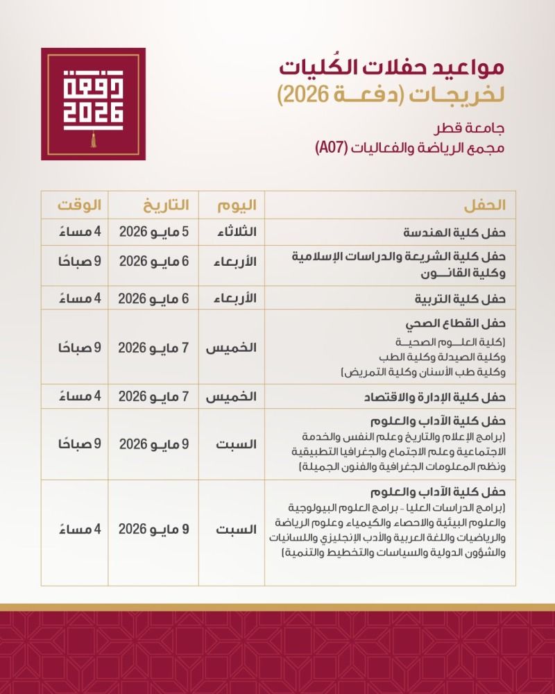 أعلنت جامعة قطر عن مواعيد حفلات الكليات لخريجات دفعة 2026