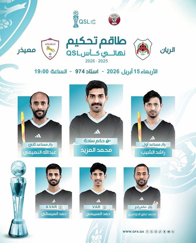 أسندت إدارة التحكيم بالاتحاد القطري لكرة القدم مهمة إدارة المباراة النهائية لبطولة "كأس QSL" والتي تجمع ناديي الريان ومعيذر، إلى طاقم تحكيم يضم كلاً من محمد المزيد حكماً، وراشد الشيب مساعداً أول، وعبدالله النعيمي مساعداً ثانياً، فيما تم تعيين محمد علي الدوسري حكماً رابعاً، كما سيتولى حمد السبيعي مهمة حكم الفيديو (VAR)، ويعاونه حمد العيسائي كحكم فيديو مساعد (AVAR)، ومن المقرر أن تُقام المباراة النهائية مساء الأربعاء 15 أبريل الجاري، عند الساعة السابعة مساءً، على استاد 974.