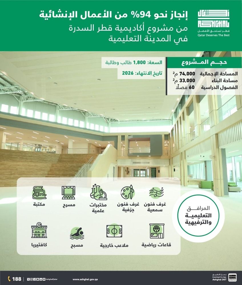 ويأتي تنفيذ المشروع ضمن استراتيجية الدولة لتعزيز البنية التحتية التعليمية وتوفير منشآت نموذجية تلبي تطلعات الأجيال القادمة. وتعكس هذه الخطوة التزام هيئة الأشغال العامة بالمساهمة الفعالة في تحقيق ركيزة التنمية البشرية ضمن رؤية قطر الوطنية 2030 من خلال تسليم مشاريع تعليمية مستدامة تتبع أرقى المعايير العالمية في التصميم والتنفيذ.