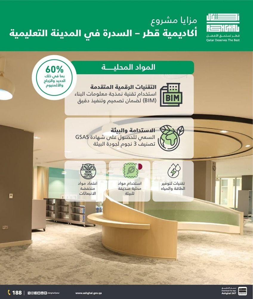 وفيما يتعلق بالتصميم والاستدامة، أوضحت "أشغال" أن تنفيذ المشروع يتم وفق أعلى المعايير المحلية والدولية، بما يعكس الهوية الثقافية لدولة قطر، ويتماشى مع معايير الاستدامة، حيث يستهدف المشروع الحصول على تصنيف 3 نجوم وفق نظام تقييم الاستدامة العالمي (GSAS)، ويتضمن المشروع تطبيق تقنيات حديثة لترشيد استهلاك الطاقة والمياه، واستخدام مواد صديقة للبيئة ومنخفضة الانبعاثات (Low VOC)، إلى جانب توفير بيئة داخلية صحية وآمنة، وأنظمة متطورة لتعزيز كفاءة الطاقة والحفاظ على الموارد الطبيعية.