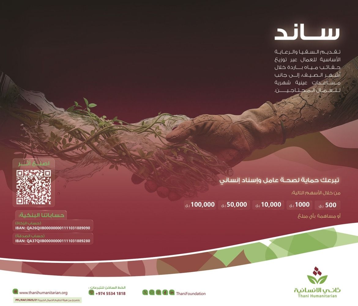 مشروع «ساند» مبادرة نوعية لسقاية ورعاية العمال بوصفه أحد المشاريع الرائدة التي تجمع بين الرعاية الاجتماعية والسقيا، بهدف الإسهام في تحسين جودة الحياة للعمال ذوي الدخل المحدود في قطر، وصناعة أثر إنساني مباشر ومستدام يعكس قيم العطاء والتلاحم المجتمعي.