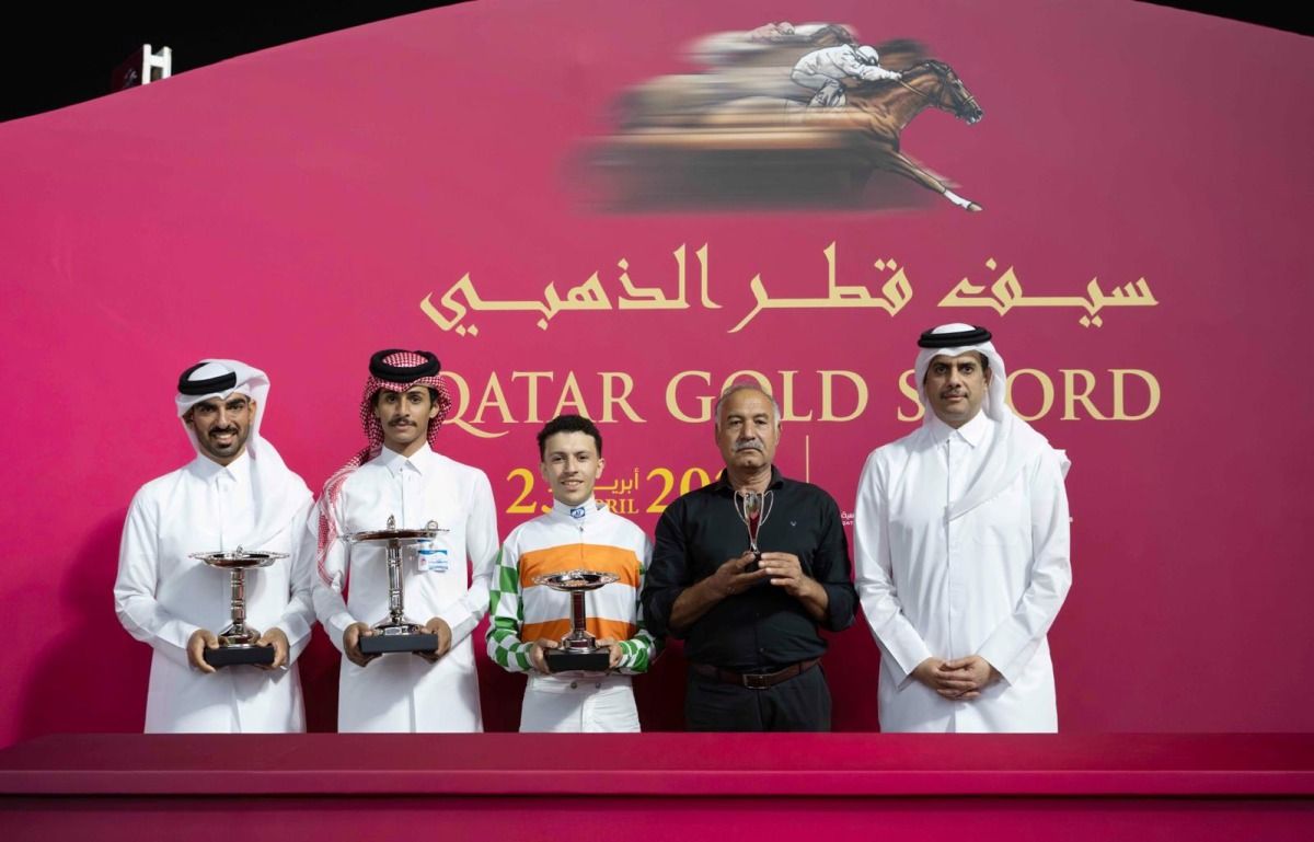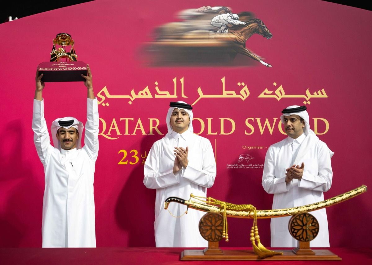 توج سعادة الشيخ ثاني بن حمد آل ثاني الفائزين بسيف قطر الذهبي من الفئة الأولى للخيل العربية الأصيلة 4 سنوات فما فوق لمسافة 2000م وذلك خلال سباق الخيل الذي نظمه نادي قطر للسباق والفروسية مساء اليوم الخميس على سيف قطر الذهبي.
