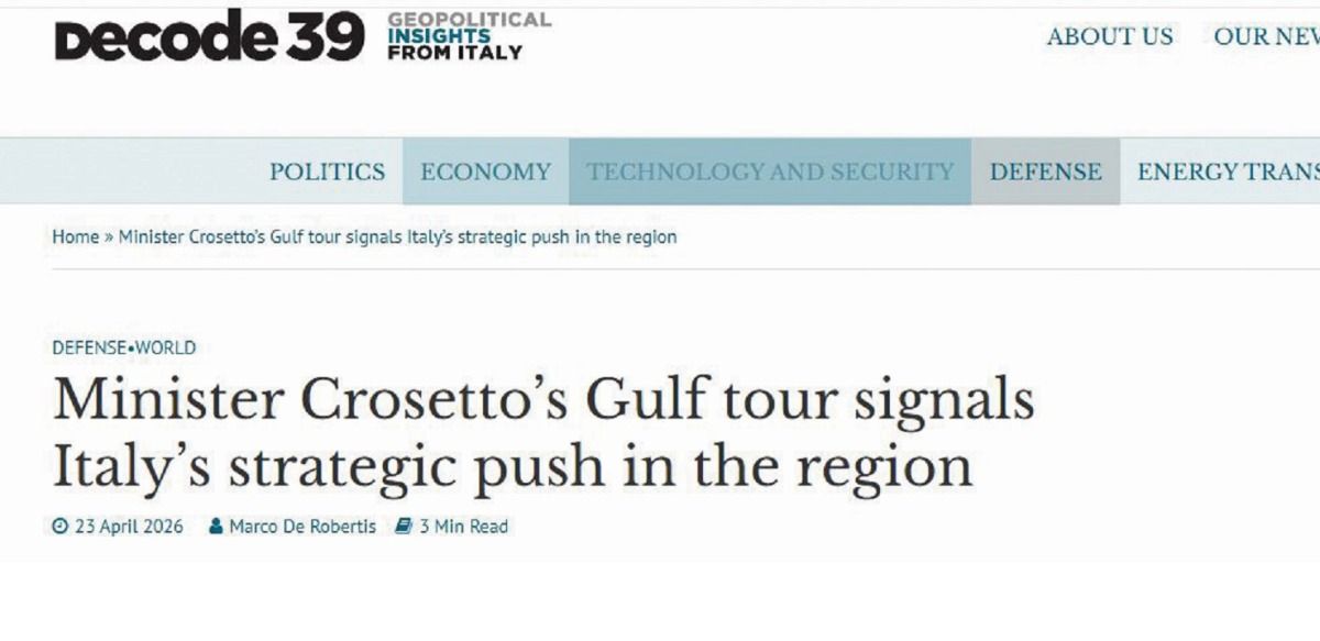 أكدت وسائل إعلام إيطالية أهمية زيارة وزير الدفاع الإيطالي جويدو كروسيتو للدوحة ومنطقة الخليج ، في إطار مساعٍ تهدف إلى تعزيز صورة روما كشريك موثوق سياسيًا وفاعل عسكريًا في المنطقة. وركزت زيارته للدوحة على ربط الأمن الإقليمي بالاستقرار البحري والتعاون الدفاعي ضمن رؤية استراتيجية متكاملة.