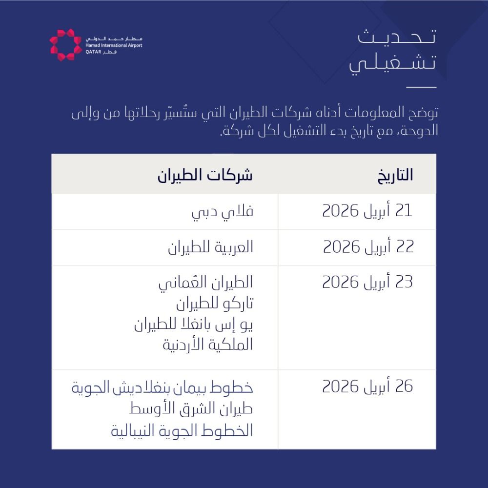 ودعا المطار المسافرين إلى التواصل مباشرة مع شركات الطيران للحجز والاستعلام عن جداول الرحلات.