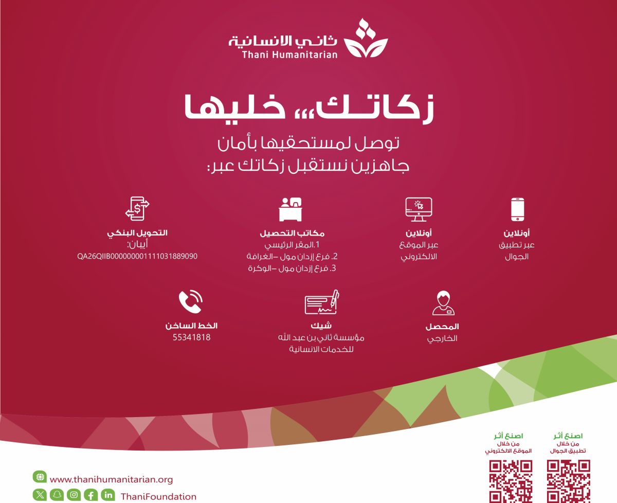 وأكدت مؤسسة ثاني الإنسانية أن هذه المشاريع معتمدة لاستقبال أموال الزكاة، وتصرف بالكامل في مصارفها الشرعية، وفق ضوابط واضحة وآليات دقيقة تضمن وصولها إلى مستحقيها، وتحقق أعلى معايير الشفافية والحوكمة في إدارة الموارد الخيرية.