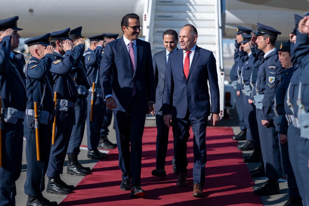 وكان في استقبال سموه لدى وصوله إلى مطار أثينا الدولي، سعادة السيد جيورجيوس جيرابيتريتيس وزير خارجية الجمهورية اليونانية، وسعادة السيد علي بن خلفان المنصوري سفير الدولة لدى الجمهورية اليونانية، وأعضاء السفارة القطرية.