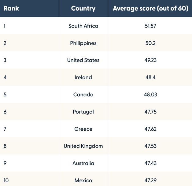وجاءت جنوب أفريقيا في المركز الأول عالميا بدرجة 51.57، ووصف التقرير شعبها بأنه لطيف، كما تضع رفاهية الآخرين في صميم قراراتها.