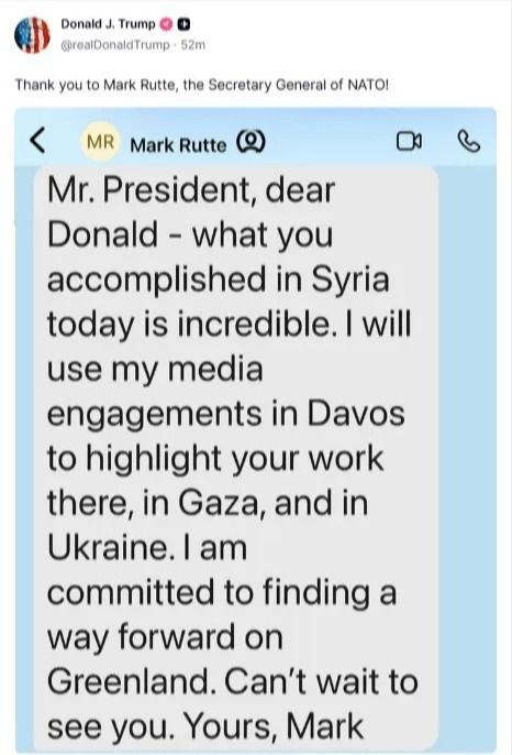 في مجموعة من الرسائل المنشورة على موقع Truth Social، يقول الأمين العام لحلف الناتو روته: “سيدي الرئيس، عزيزي دونالد – ما أنجزته في سوريا اليوم أمر لا يصدق، سأستغل مشاركاتي الإعلامية في دافوس لتسليط الضوء على عملكم هناك، وفي غزة، وفي أوكرانيا”.