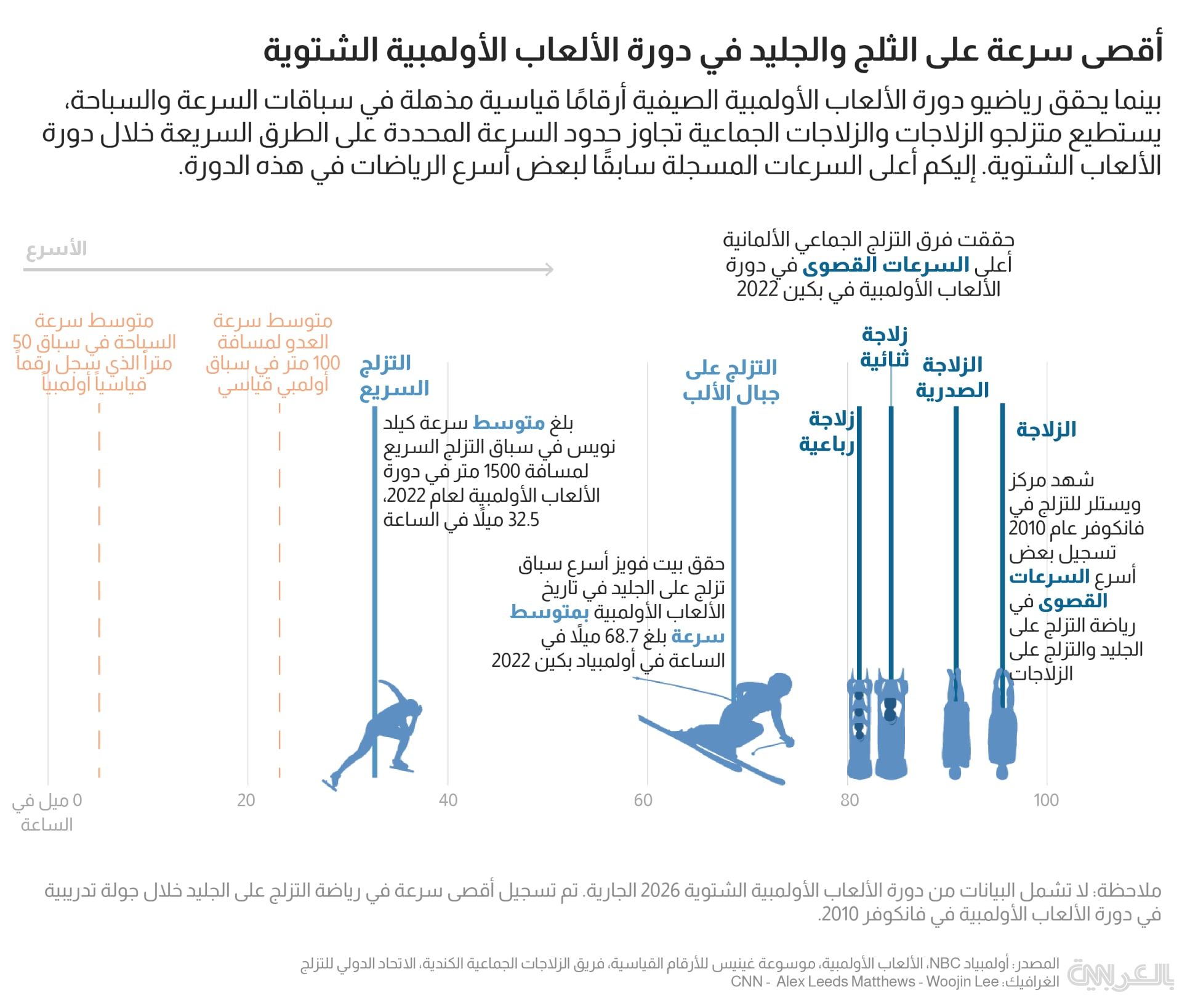 أما في الرياضات الشتوية، فيختبر الرياضيون تلك الحدود بشكل أكبر، مستعينين بالجاذبية أو بمركبات مثل الزلاجات والزلاجات الجماعية للوصول إلى سرعات الطرق السريعة أو تجاوزها.