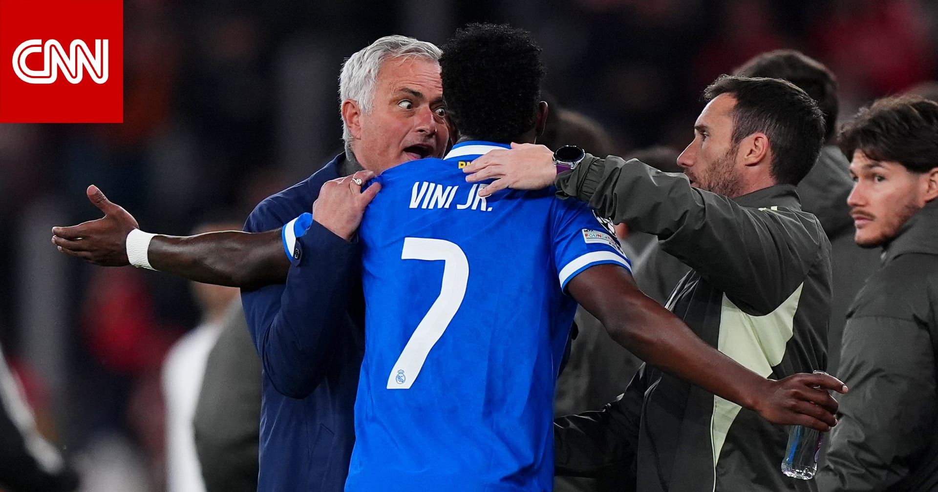 وتحدث كلا المدربين، مورينيو مدرب بنفيكا وألفارو أربيلوا مدرب ريال مدريد، إلى فينيسيوس بالقرب من مقاعد البدلاء.