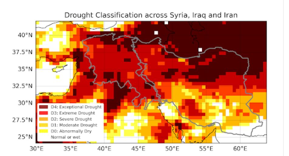 وتشير تقارير الأمم المتحدة إلى أن شرق المتوسط شهد منذ شتاء 2020-2021 موجات جفاف متكررة مرتبطة بتغيّر المناخ. فيما توثّق وزارة الموارد المائية العراقية والأمم المتحدة (يونيسف/برنامج الأغذية العالمي) في عام 2023 أن البلاد تواجه منذ سنوات انخفاضاً حاداً في تدفقات دجلة والفرات، وأن موجات الجفاف اشتدّت بشكل ملحوظ في أعوام 2008 و2015 و2022، مع ارتفاع لافت في درجات الحرارة وازدياد معدلات التبخر. من جهة ثانية، فإن سوريا والعراق مصنّفان بين أكثر البلدان هشاشة لتأثيرات المناخ؛ فالعراق ضمن أكثر خمس دول تأثراً عالمياً، مع تهديد التصحر لـ92 في المائة من أراضيه وارتفاع الحرارة بمعدل يفوق المتوسط العالمي بعدة أضعاف. وتفيد التقديرات السكانية الرسمية بأن عدد سكان العراق تجاوز 43 مليون نسمة في 2024، وفق الجهاز المركزي للإحصاء العراقي، ما يزيد الضغط على الموارد المائية.