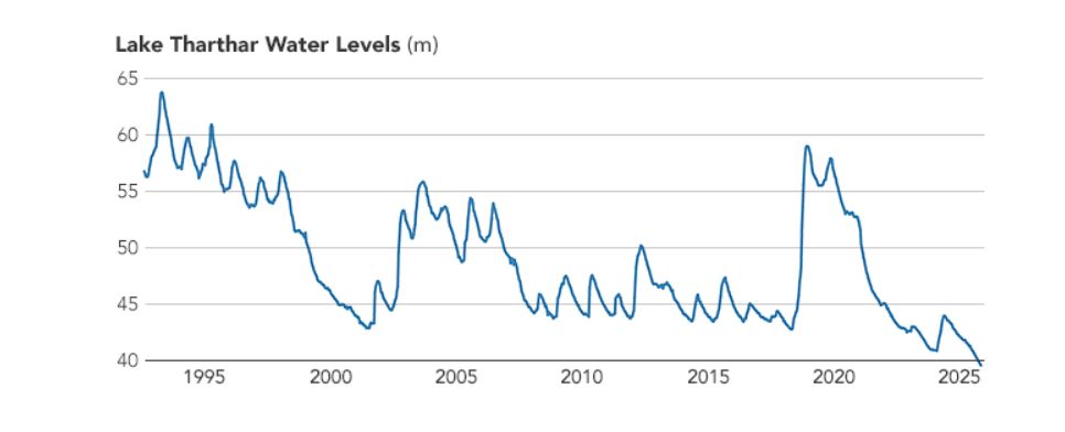 دجلة والفرات - العراق وسوريا وتركيافي العراق، أصبح عام 2025 العام الأكثر جفافاً على الإطلاق منذ عام 1933، حيث انخفضت مستويات المياه في نهري دجلة والفرات بنسبة تصل إلى 27 في المائة بسبب قلة هطول الأمطار والقيود المفروضة على المنبع، إضافة إلى لجوء إيران إلى قطع 4 روافد لنهر دجلة. في سوريا المجاورة، انخفض معدل هطول الأمطار بنسبة تقارب 70 في المائة، مما أدى إلى شلل 75 في المائة من الأراضي الزراعية البعلية في البلاد، وترك عجزاً يقدر بنحو 2.73 مليون طن من القمح، وفق تقرير من منظمة «وورلد ويزر أتريبيوشن».