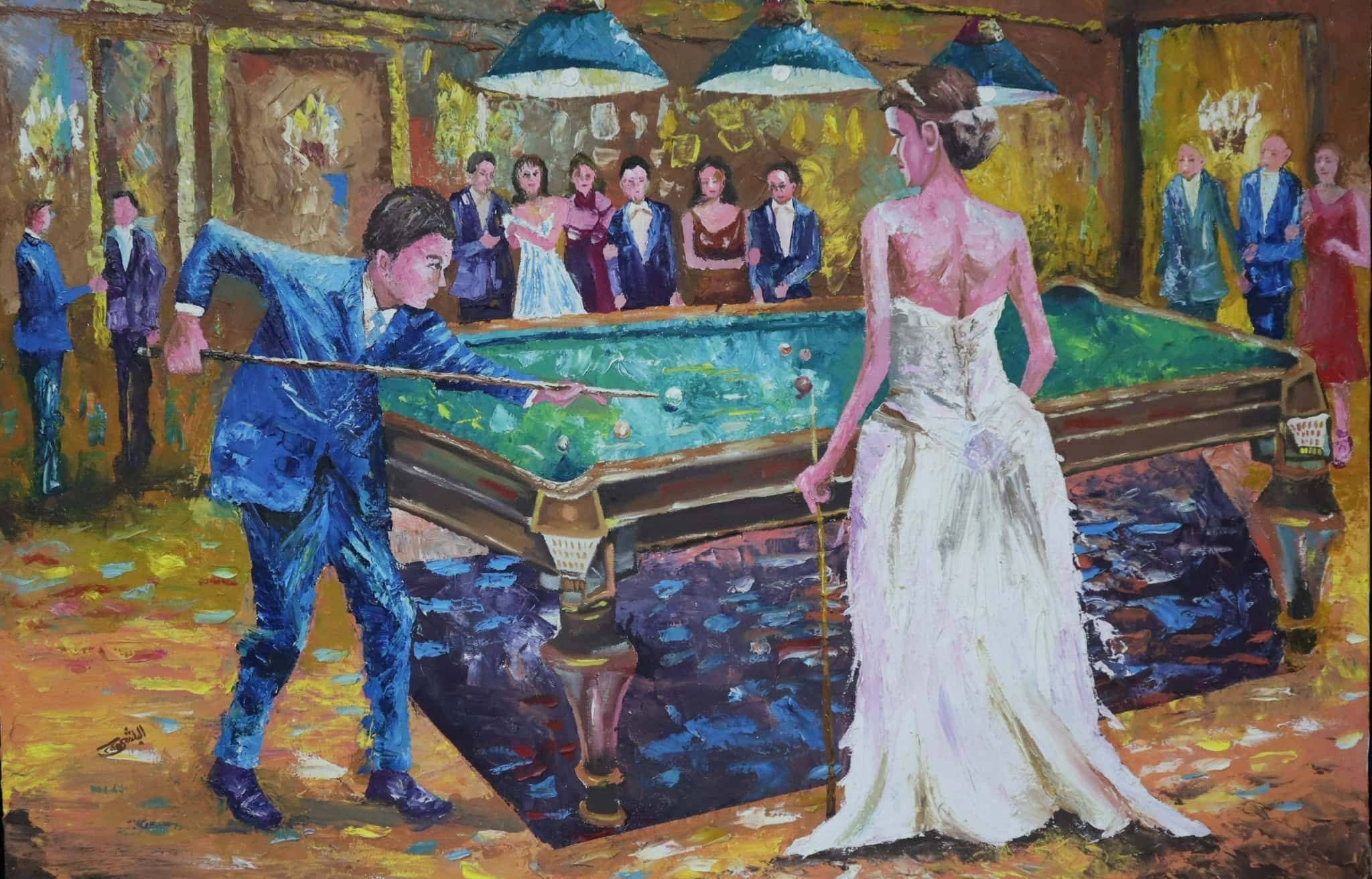لم تكن قاعة الفرح سوى مسرح الحياة نفسه، ولم يكن التباين في الألوان والحالات التي تجسدها أعماله إلا تناقضات الحياة ذاتها، يقول الفنان سامي البلشي لـ«الشرق الأوسط»: «تناول معظم الفنانين ليلة العرس، لكنهم ركزوا خلال ذلك على الأجواء الاحتفالية والطقوس المرتبطة به كالحنة، والتحطيب وصواني الكعك والصباحية».