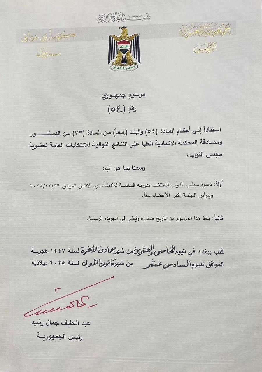 اخبار العرب -كندا 24: الثلاثاء 16 ديسمبر 2025 10:27 صباحاً دعا الرئيس العراقي عبد اللطيف جمال رشيد، الثلاثاء، البرلمان العراقي الجديد إلى عقد جلسته الأولى في تاريخ الـ29 من ديسمبر (كانون الأول) الحالي.