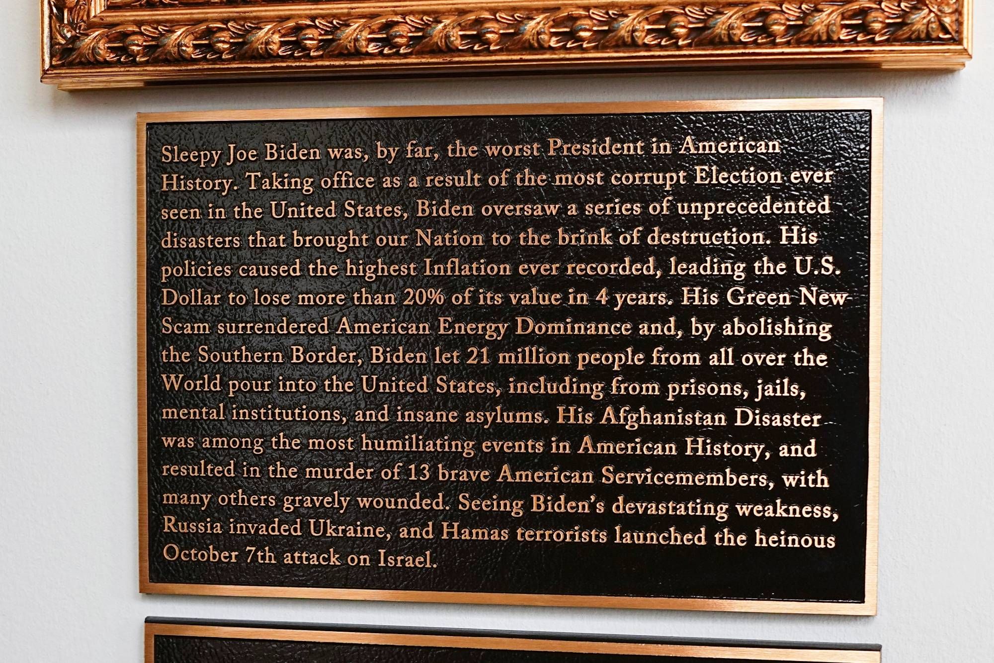 وبحسب شبكة «سكاي نيوز» البريطانية، فمن بين هذه اللوحات، التي يبدو أن ترمب نفسه هو من كتبها، لوحة عن جو بايدن كُتب عليها: «كان (جو النائم)، دون شك، أسوأ رئيس في تاريخ أميركا».
