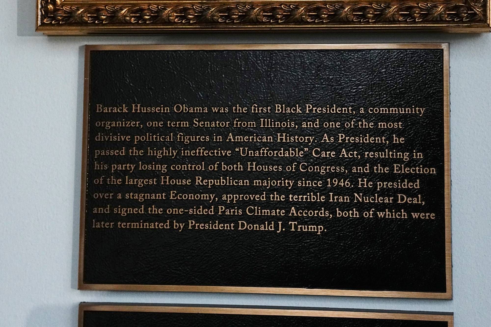 أما اللوحة الموجودة أسفل صورة بيل كلينتون، فقد جاء فيها أنه «في عام 2016، خسرت هيلاري كلينتون، زوجة الرئيس كلينتون، الرئاسة أمام الرئيس دونالد ترمب!».