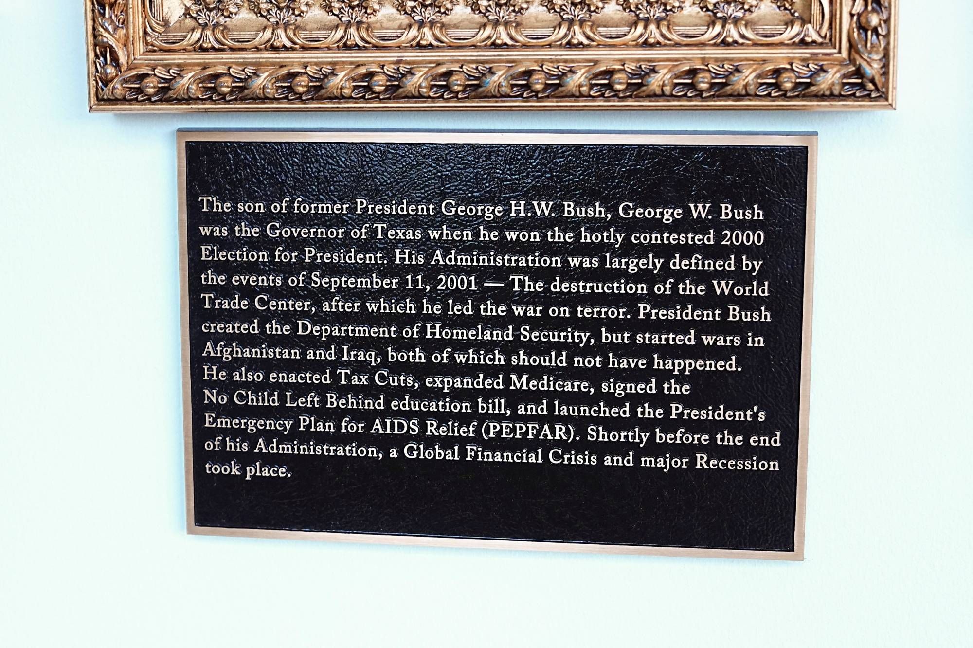 حتى جورج دبليو بوش، وهو جمهوري مثله - وإن لم يكن من مؤيدي ترمب – فلم يسلم من الانتقاد، إذ كُتب على لوحته أن الرئيس الأسبق «أشعل حربين في أفغانستان والعراق، وكلتاهما كان ينبغي ألا تحدث».