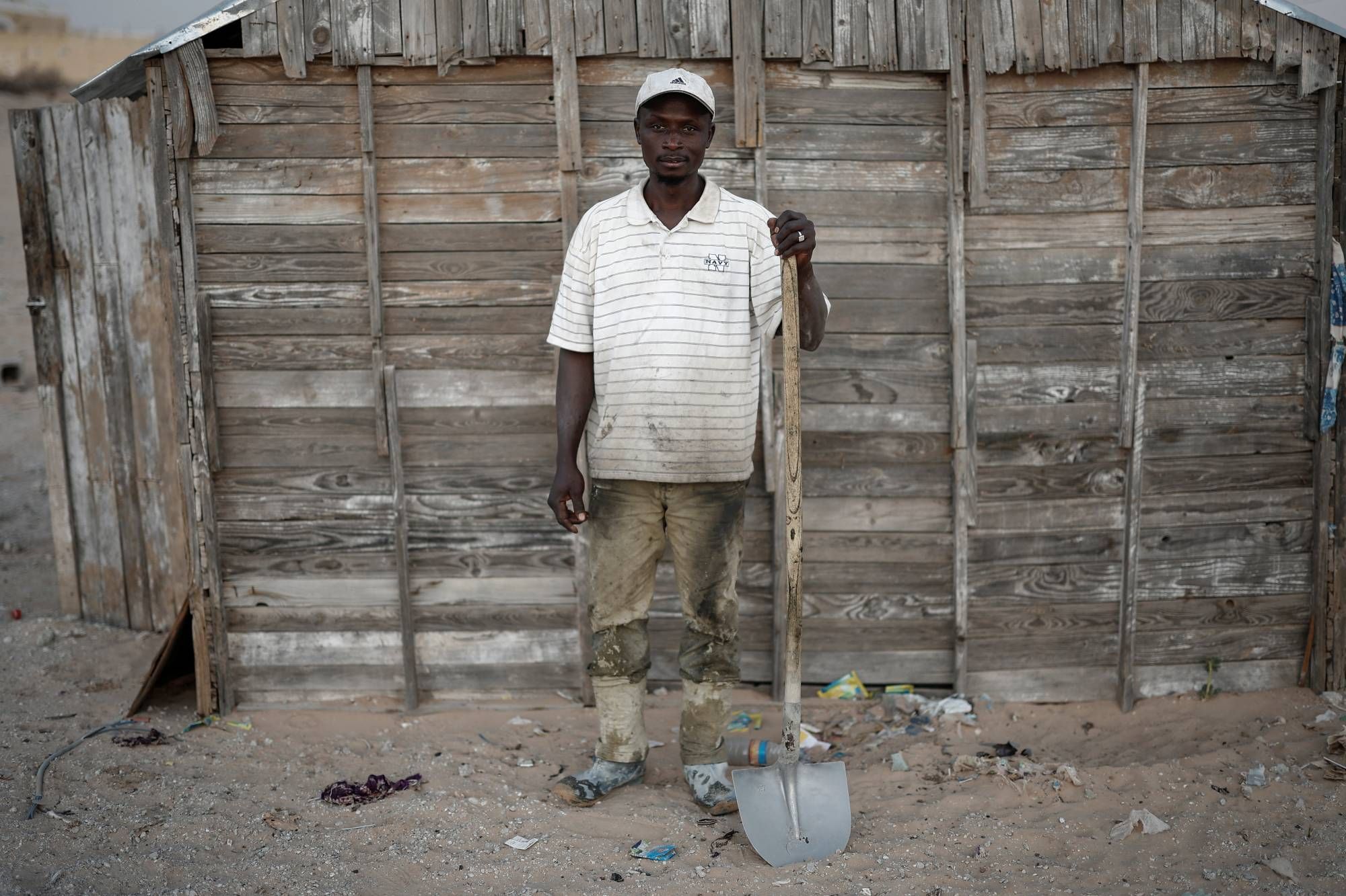 معاناة المهاجرين في موريتانيايعمل ديالو ليلاً لمدة 15 يوماً في كل مرة بأحد المواقع على مشارف نواكشوط، وينام خلال النهار مع ثلاثة رجال آخرين في كوخ خشبي بسقف من الحديد المموّج على أسرَّة من الطوب يعدونها ليلاً لتجنب ارتفاع درجات الحرارة.