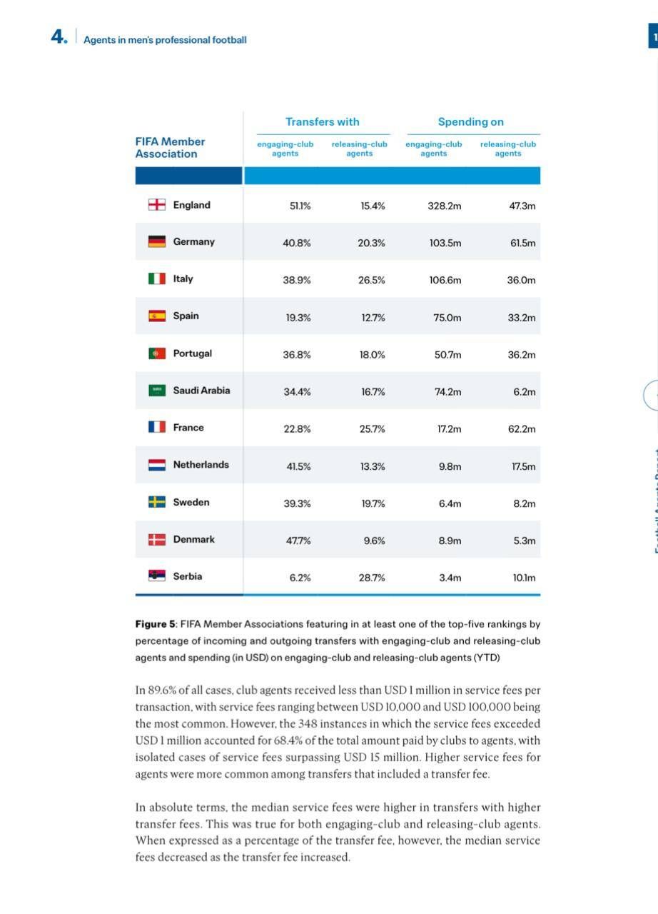ووفقاً لـ«فيفا»، فقد استحوذت كرة القدم الأوروبية على الحصة الكبرى من رسوم الوكلاء، حيث تصدرت الأندية الإنجليزية القائمة بدفعها أكثر من 375 مليون دولار لوكلاء اللاعبين فقط، تلتها الأندية الألمانية في المرتبة الثانية، حيث تكبدت 165 مليون دولار. وجاءت إيطاليا ثالثةً بإجمالي وصل إلى قرابة 146 مليون دولار، ثم إسبانيا رابعة بإنفاق بلغ نحو 140 مليون دولار. وجاءت البرتغال في المركز الخامس بإنفاق يُقدَّر بنحو 90 مليون دولار.