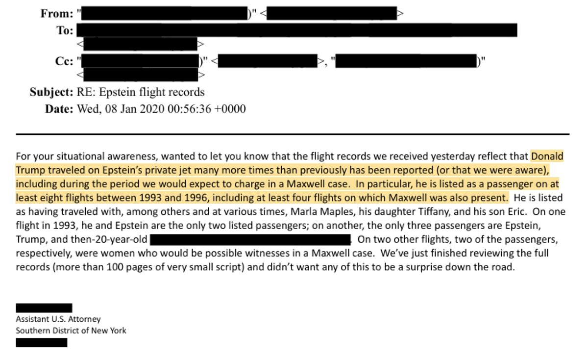 - في رسالة بريد إلكتروني مؤرخة في 8 يناير/كانون الثاني 2020، كتب مساعد المدعي العام الأمريكي للمنطقة الجنوبية من نيويورك أن سجلات الرحلات الجوية تُظهر أن الرئيس دونالد ترامب "سافر على متن طائرة إبستين الخاصة مرات أكثر بكثير مما تم الإبلاغ عنه سابقًا (أو مما كنا على علم به)".