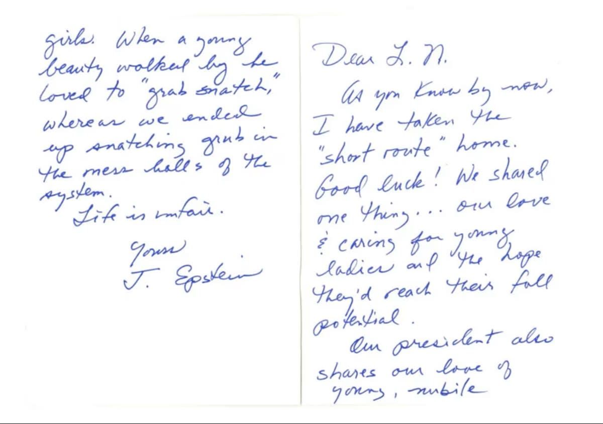 - وُجّهت رسالة موقعة باسم "ج. إبستين" إلى لاري نصار، المدان بالاعتداء الجنسي، في نفس الشهر الذي انتحر فيه إبستين عام 2019، حين كان ترامب رئيسًا.