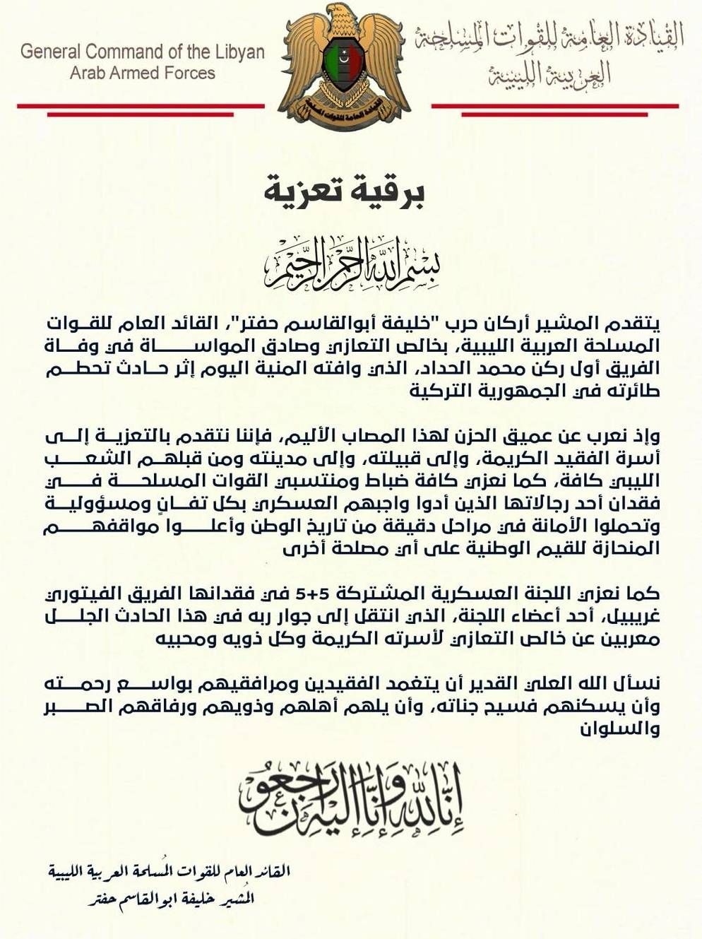 حفتر ينعيونعى قائد الجيش الوطني الليبي خليفة حفتر وفاة الحداد والوفد المرافق له في تحطم طائرتهم.