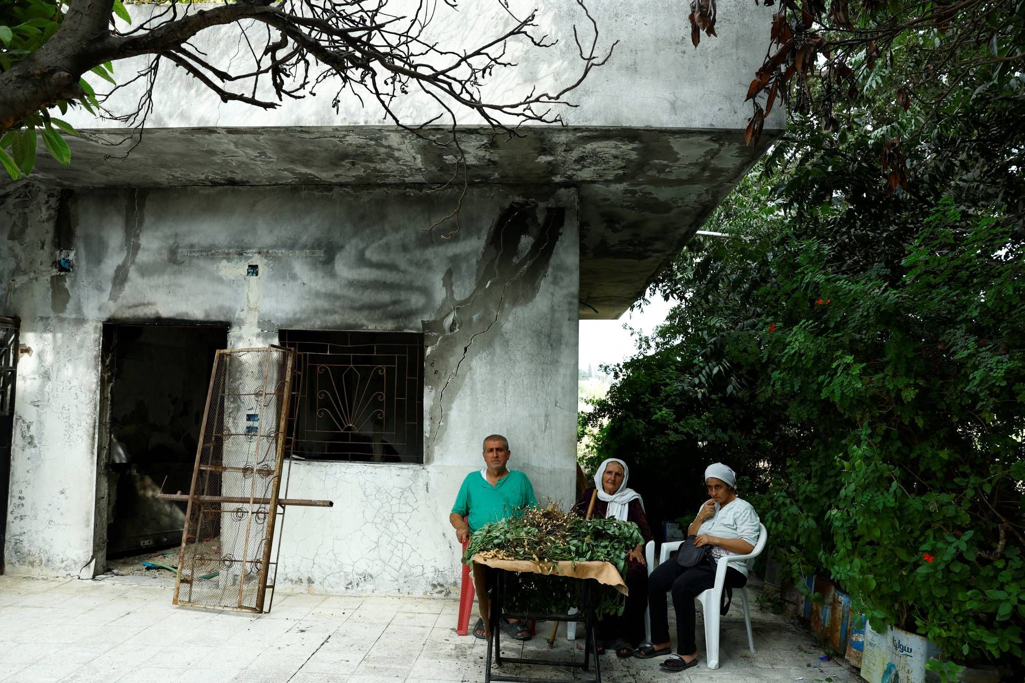 وائل حسن مع أفراد عائلته في حديقة منزله المحترق في جبلة بسوريا (رويترز)