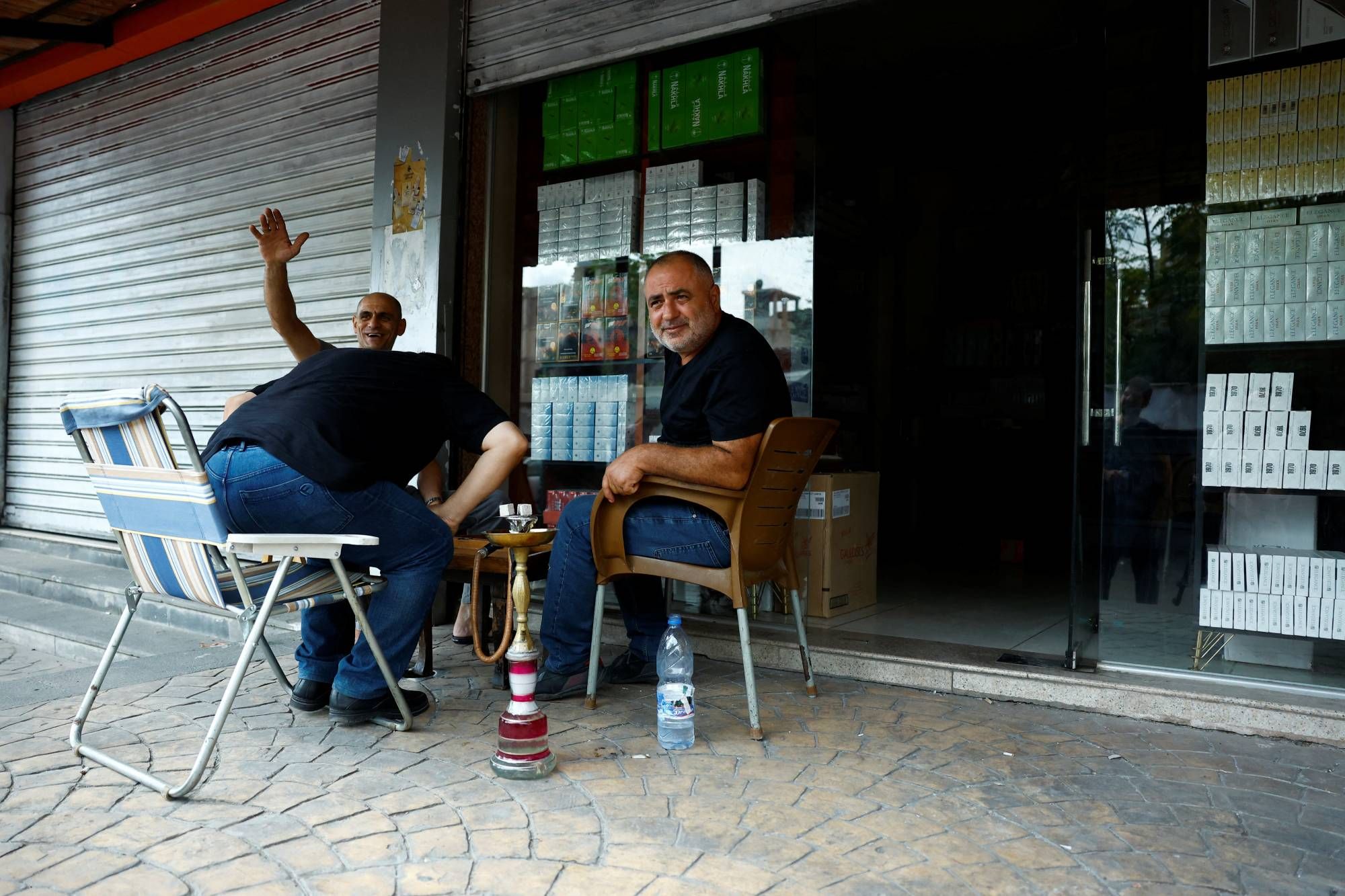 رجال يدخنون الشيشة خارج محل لبيع تبغ في ريف اللاذقية 25 سبتمبر (رويترز)