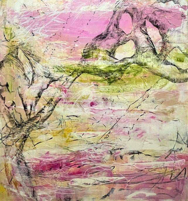 وفي لوحتها «جروح تعرف طريق العودة إلى الوطن»، المشاركة ضمن معرض «مختارات منتقاة بعناية»، تدوّر شعّار الزوايا، وتخفّف من وطأة الجراح عبر صورة جذور شجرة تطفو فوق الأرض، غمرتها بدرجات بنفسجية مائلة إلى الزهري، في طريق يزهو بالسلام.
