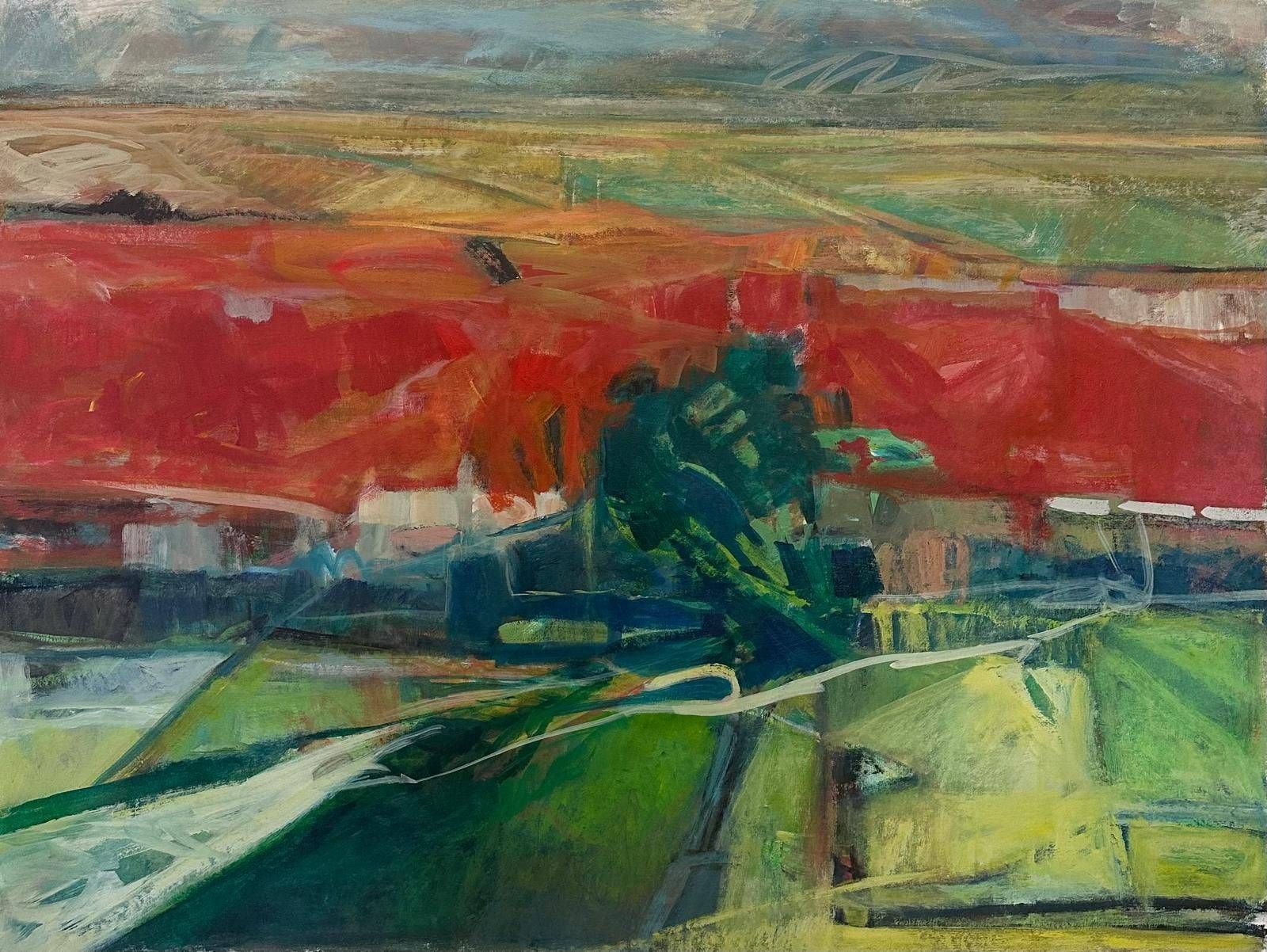 ومن سهل البقاع، حيث تحضر طبيعة لبنان بكل أبعادها الجمالية، تبرز أعمال غادة جمّال. فإقامتها المتنقّلة بين الولايات المتحدة ولبنان تسهم في تأجيج مشاعر الحنين لوطن تفتقده حتى وهي على أرضه. اللون هو العنصر الرئيسي في أعمالها، وتختار مساحات قماش واسعة لإبراز تدرّجاته وانسيابيته. وتقول لـ«الشرق الأوسط»: «جميعها مناظر استوقفتني على أرض الواقع. كنت أتنشّق هواء لبنان وأستمتع بجماله في آن. وفي طريقي إلى البقاع، غصَّت في مساحات من سهل خصب. وقدّمت هذه الصور الدافئة، وفيها تركت الأحمر يصعد بتدرّجاته، سابحاً في أفق مفتوح على غروب الشمس».