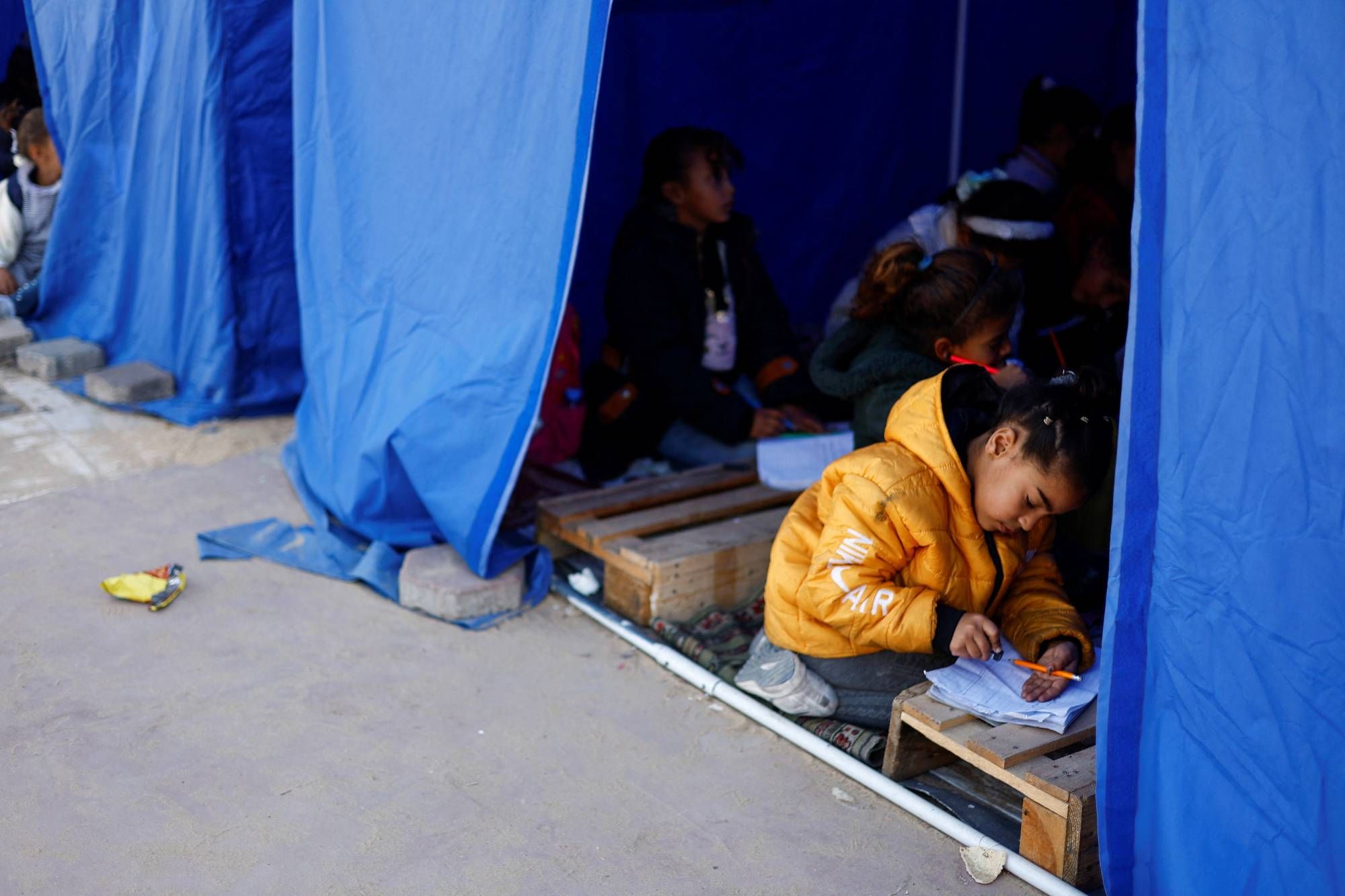 وتولين (سبع سنوات) واحدة من حوالي 400 طفل يتعلمون في «مدرسة الشمال التعليمية» المؤقتة التي أقيمت في خيام بلاستيكية زرقاء على أنقاض في بيت لاهيا في شمال قطاع غزة، وتقع على مرمى البصر من «الخط الأصفر» الذي تسيطر عليه القوات الإسرائيلية، وفق تقرير لوكالة «رويترز» للأنباء.