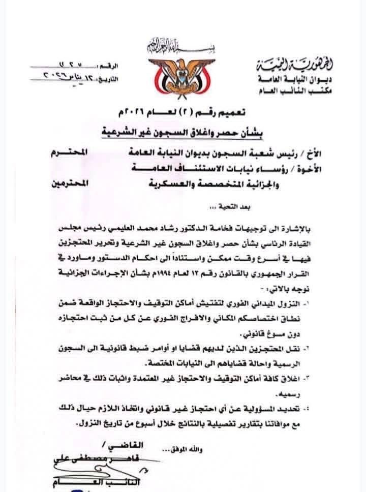 وأمر النائب العام في اليمن، رئيسَ شعبة السجون بديوان النيابة العامة، ورؤساءَ نيابات الاستئناف العامة والجزائية المتخصصة والعسكرية، بالنزول الميداني الفوري لتفتيش أماكن التوقيف والاحتجاز الواقعة ضمن نطاق الاختصاص المكاني لكل جهة، والإفراج الفوري عن كل من ثبت احتجازه دون مسوغ قانوني.
