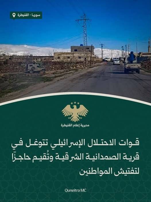 وتوغلت «قوة إسرائيلية مؤلفة من سيارتي هايلكس وهمر في بلدة بئر عجم باتجاه قرية بريقة، وتوقفت عند بئر الكباس لمدة تقارب عشر دقائق، ثم انسحبت من المنطقة»، بحسب مصادر أهلية. فيما أفادت قناة «الإخبارية السورية» بأن قوات إسرائيلية «نصبت حاجزاً عسكرياً مكوناً من 3 آليات في قرية الصمدانية الشرقية بريف القنيطرة وقامت بتفتيش المارة».