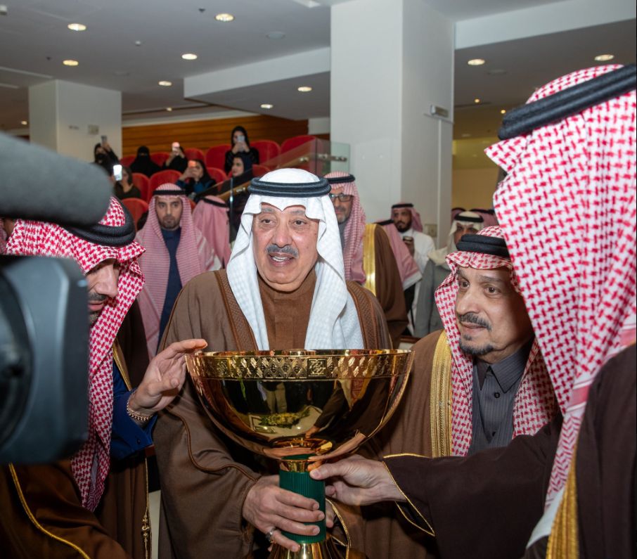 أمير منطقة الرياض يسلّم الكأس إلى الأمير فيصل بن خالد بعد تتويج الجواد «ذياف» (نادي سباقات الخيل)
