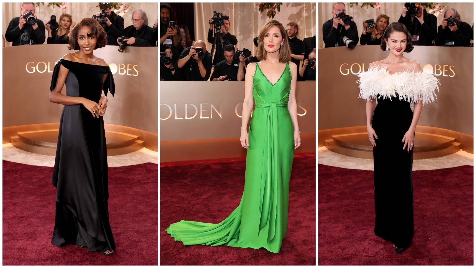من فستان بريانكا شوبرا من دار «ديور» إلى فستان سيلينا غوميز الأسود المزين بالريش من «شانيل» أو إطلالة الممثلة روز بيرن بفستان أخضر يستحضر صورة ريتا هايوارث ومارلين مونرو وغيرهما من نجمات الخمسينات، والممثلة آيو إدبيري في فستانها الأسود الأنيق المشبوك عند الكتف بدبوس، كانت الصورةَ العامة: فساتين بلا أكتاف في الغالب، قفازات طويلة، ذيول تمسح الأرض وتسريحات شعر ومكياج أيضاً من الزمن نفسه.