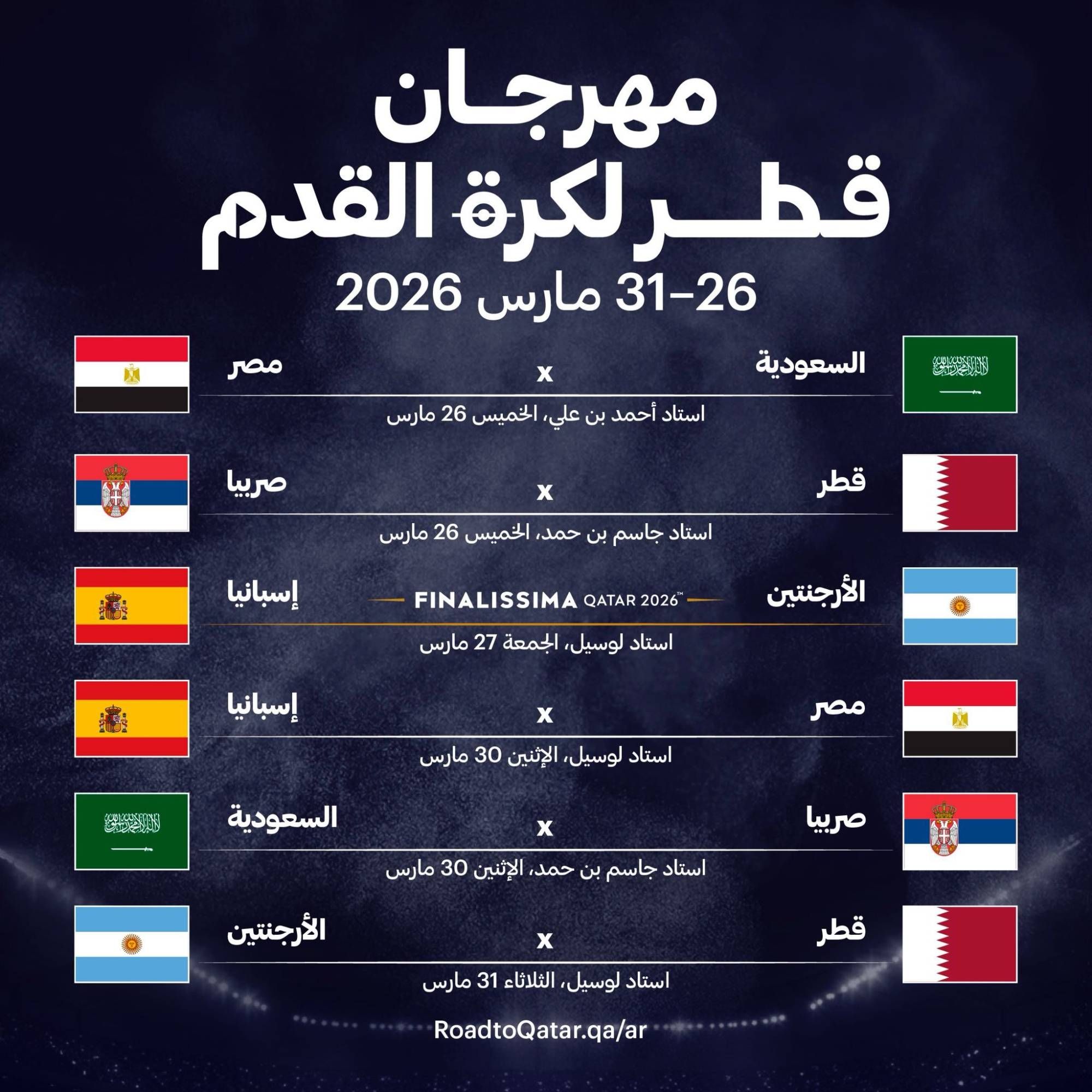 وتشهد نسخة المهرجان إقامة ست مباريات، تتقدمها مباراة كأس فيناليسيما 2026، التي ستقام يوم 27 مارس على استاد لوسيل الأيقوني، وتجمع بطل أوروبا منتخب إسبانيا وبطل أميركا الجنوبية منتخب الأرجنتين، في مواجهة مرتقبة بين حاملي الألقاب القارية.