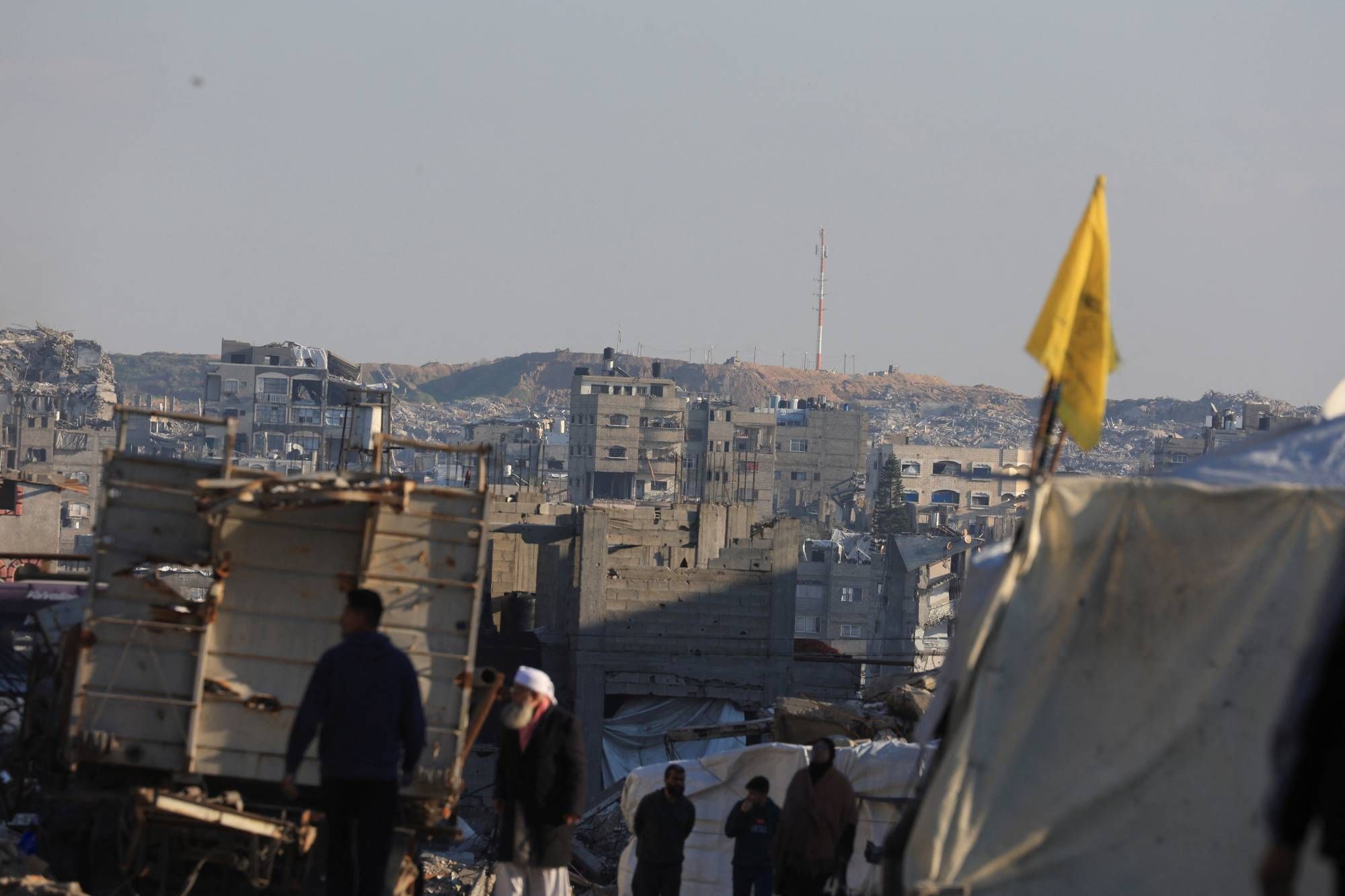 وتبدو منطقة السيطرة الإسرائيلية الآخذة في الاتساع أكثر وضوحاً في حي التفاح الذي كان يوماً ما حياً تاريخياً في مدينة غزة، لكنه صار أرضاً قاحلة تنتشر بها المباني المدمرة والحطام المعدني جراء القصف الإسرائيلي على مدى عامين.