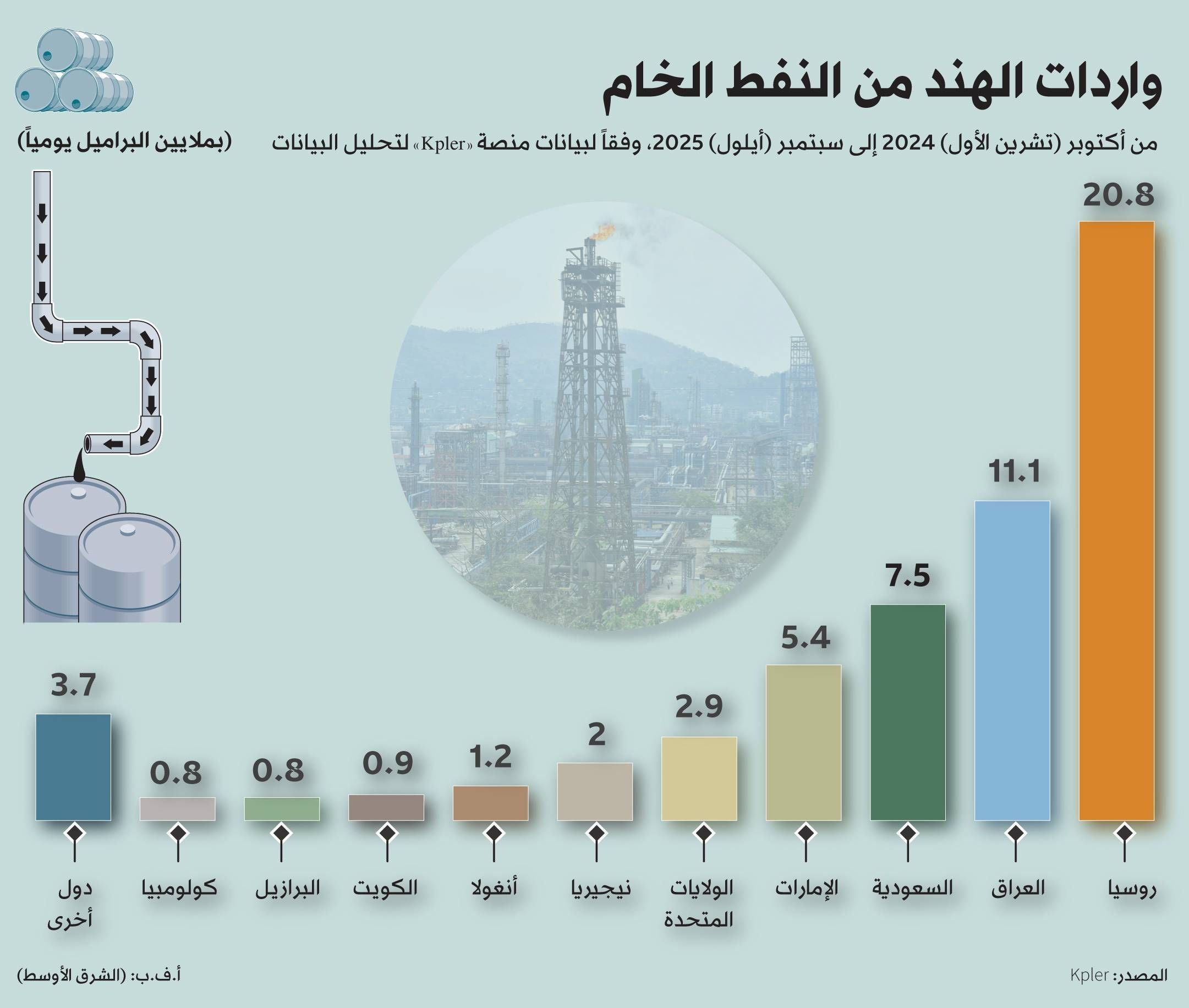 وتشتري الهند نحو 90 في المائة من نفطها الخام من الخارج، وكانت أكبر سوق للنفط الروسي المنقول بحراً منذ عام 2023، وفقاً لبيانات تتبع السفن التي جمعتها شركة «كبلر». وتستورد الهند نحو 5 ملايين برميل من النفط يومياً، يأتي مليونان منها من روسيا.