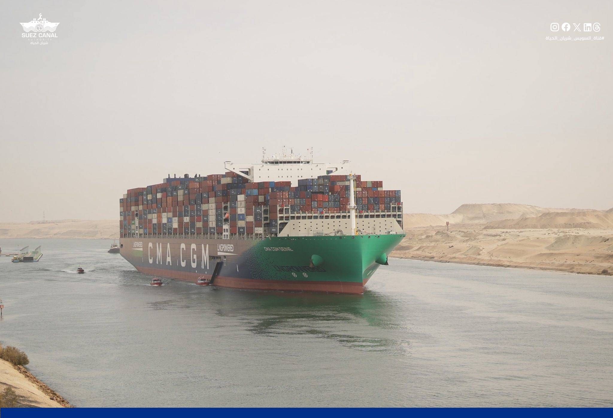وبحسب إفادة لهيئة قناة السويس، فإن السفينة تتبع الخط الملاحي الفرنسي CMA CGM ويبلغ طولها 399 متراً وعرضها 61.3 متر وغاطسها 40 قدماً، بحمولة كلية 250 ألف طن.