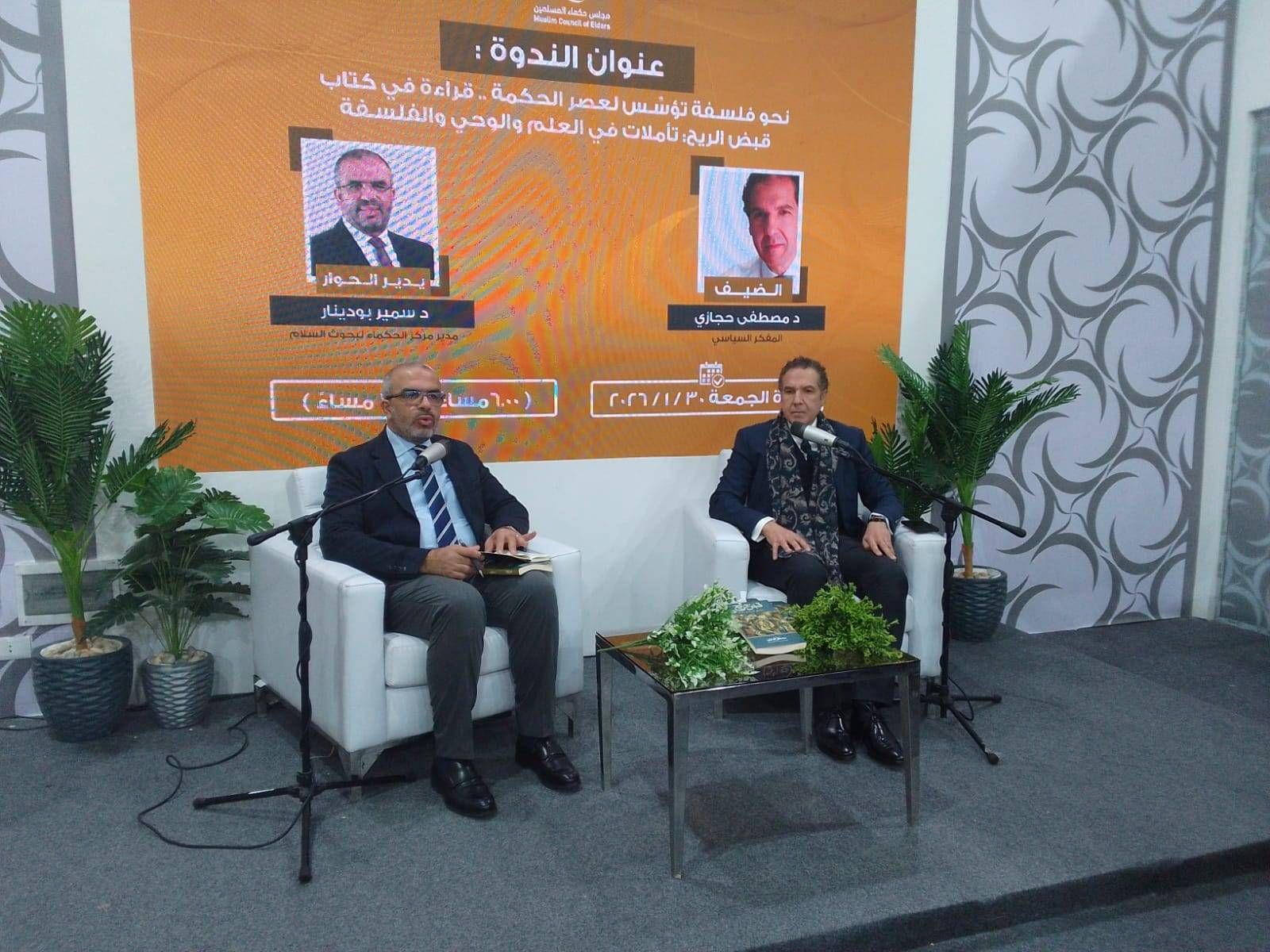 اخبار العرب -كندا 24: السبت 31 يناير 2026 10:03 صباحاً حول البحث عن معنى السعادة، وسبل تحقيقها، عبر إعادة تعريف مفاهيم الحرية والعدل والكرامة، دار النقاش في الندوة التي نظَّمها «مجلس حكماء المسلمين» في جناحه بمعرض القاهرة الدولي للكتاب في دورته الـ57، لمناقشة كتاب «قبض الريح... تأملات في العلم والوحي والفلسفة».