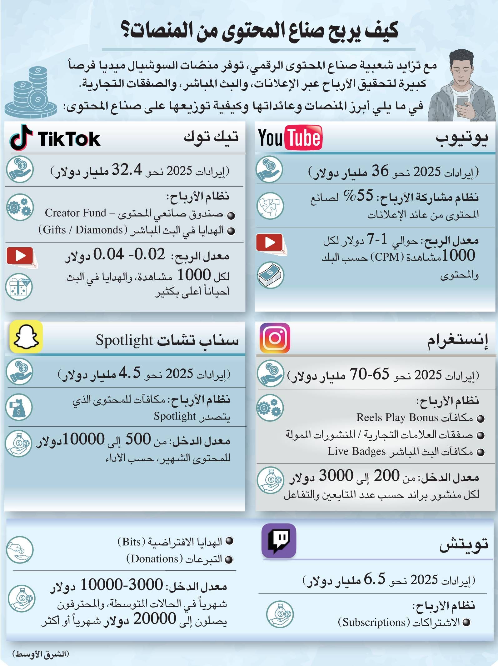 سلطة الخوارزمياتوهذا ما يؤكده الحازمي، الذي يتجنب الحديث عما يحققه من مداخيل من هذه «الصناعة»، ويقول: الإحصاءات تشير إلى أن أعلى 4 في المائة فقط من صناع المحتوى يحققون دخلاً يتجاوز 100 ألف دولار سنوياً. دورة حياة المشروع الإعلامي الشخصي تتطلب «فترة حضانة» بين 18 إلى 24 شهراً للوصول إلى نقطة التعادل، مما ينفي فكرة الثراء السريع، ويؤكد ضرورة التعامل مع الصناعة بعقلية «المؤسسة».