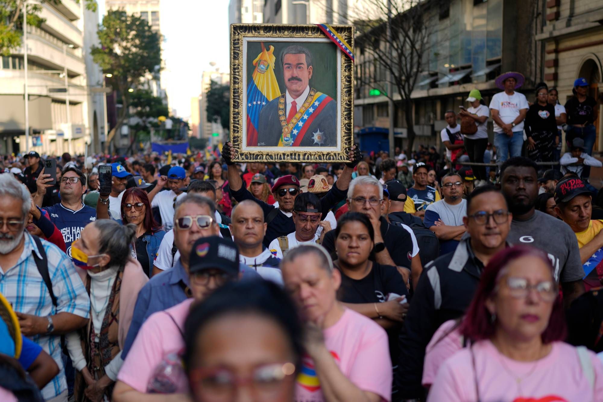 وشوهد المتظاهرون، ومعظمهم من موظفي القطاع العام، يسيرون في العاصمة الفنزويلية وهم يهتفون «فنزويلا بحاجة إلى نيكولاس»، ورفع بعضهم صور مادورو وزوجته سيليا فلوريس التي اعتقلت معه.