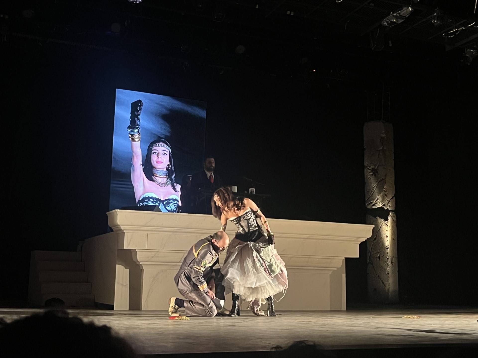 منذ الدقائق الأولى، يطغى على العمل مزيج من التراجيديا الإغريقية والمسرح الفكاهي المعاصر. تتقاطع الرسائل الاجتماعية والسياسية في محاولة لإسقاط مفاهيم يتجاوز عمرها ألفي عام على واقع راهن، فتظهر أحياناً كمرآة لواقع معيش، وأحياناً أخرى كمادة تفتح باب التأويل والتحليل.