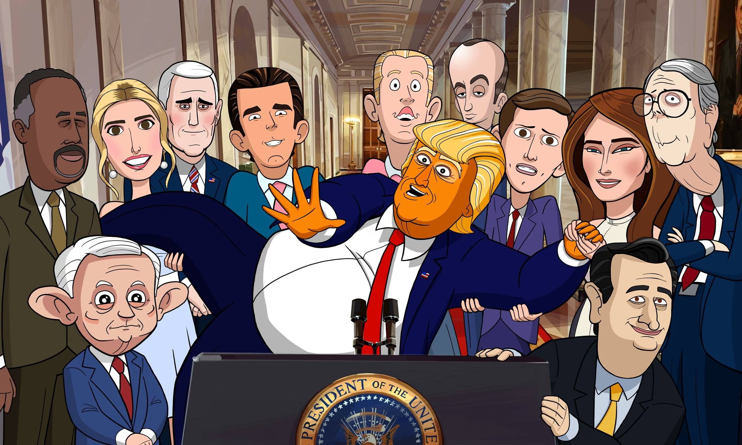 في سلسلة «Our Cartoon President» التي انطلق عرضها عام 2018، وضع الممثل والكاتب والإعلامي ستيفن كولبرت ولاية ترمب الرئاسية الأولى تحت مِجهره الساخر. تدور أحداث الرسوم المتحركة الكوميدية في البيت الأبيض ومراكز نفوذ أخرى في واشنطن؛ حيث تنقل بشكلٍ مضحك يوميات ترمب وعائلته وفريقه والإعلاميين المحيطين به.