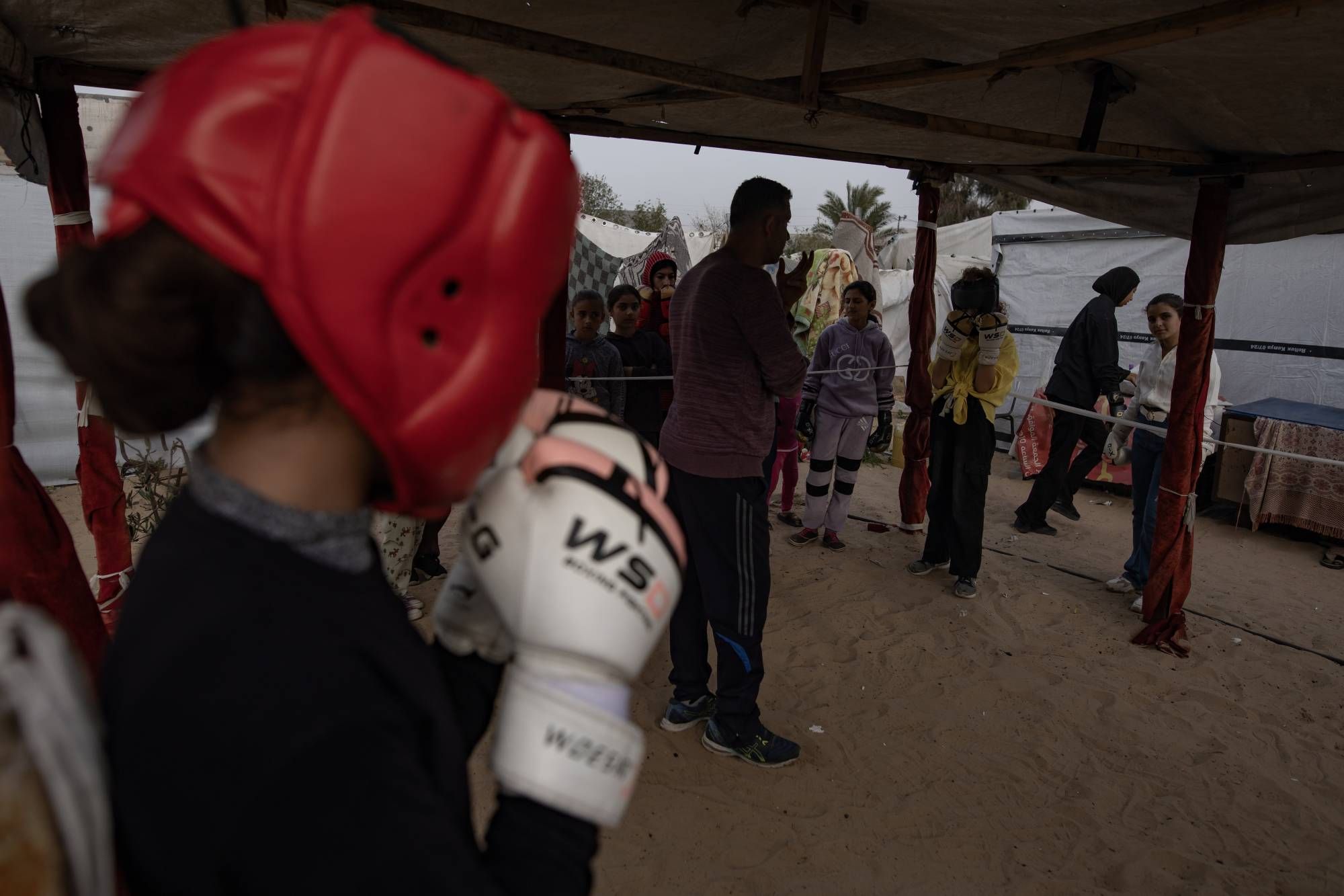 على حلبة ملاكمة مرتجلة أقيمت على الرمل بين خيام النازحين بجنوب قطاع غزة، تمارس فتيات تمارين الإحماء قبل توجيه لكمات قوية باتباع تعليمات مدربهن الذي يقول إن هذا يساعدهن على التفريغ النفسي بعد عامين من الحرب الشرسة.