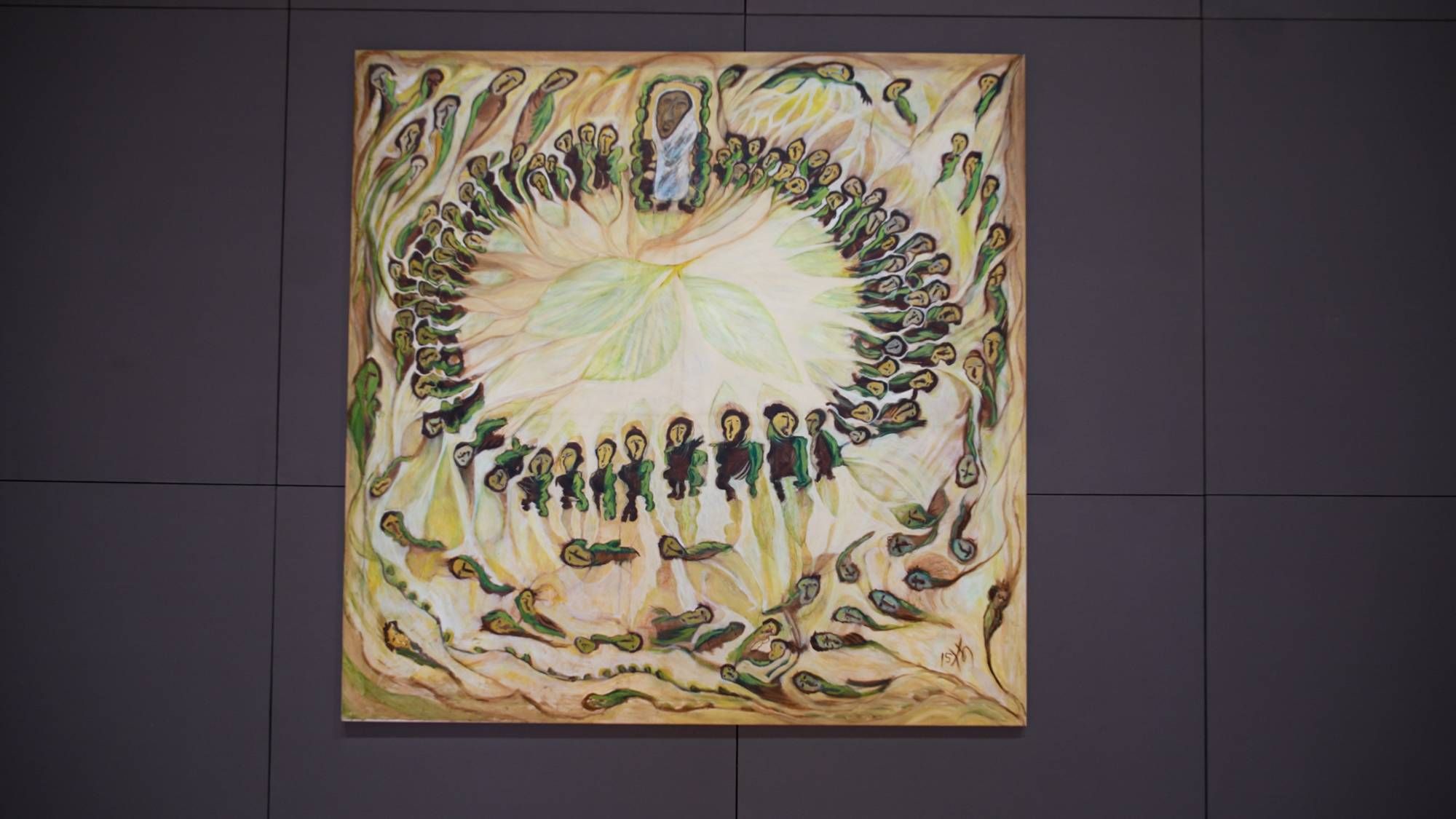 في القاعة عمل لفنان من أثيوبيا، إلياس سيمي، يعتبرها القيم جدارية من نوع آخر، فهي مصنوعة من نفايات إلكترونية اعتاد الفنان على توظيفها وإعادة تشكيلها، لتصبح مثل «النسيج». ما الذي يمكن رؤيته في هذا العمل الضخم؟ بالاقتراب من اللوحة نتبين العناصر الصغيرة التي تتجمع لتكون صورة أقرب ما تكون لتلك التي تلتقطها الأقمار الصناعية وتختزل مظاهر الحياة على الأرض في نقاط مضيئة مبهمة.