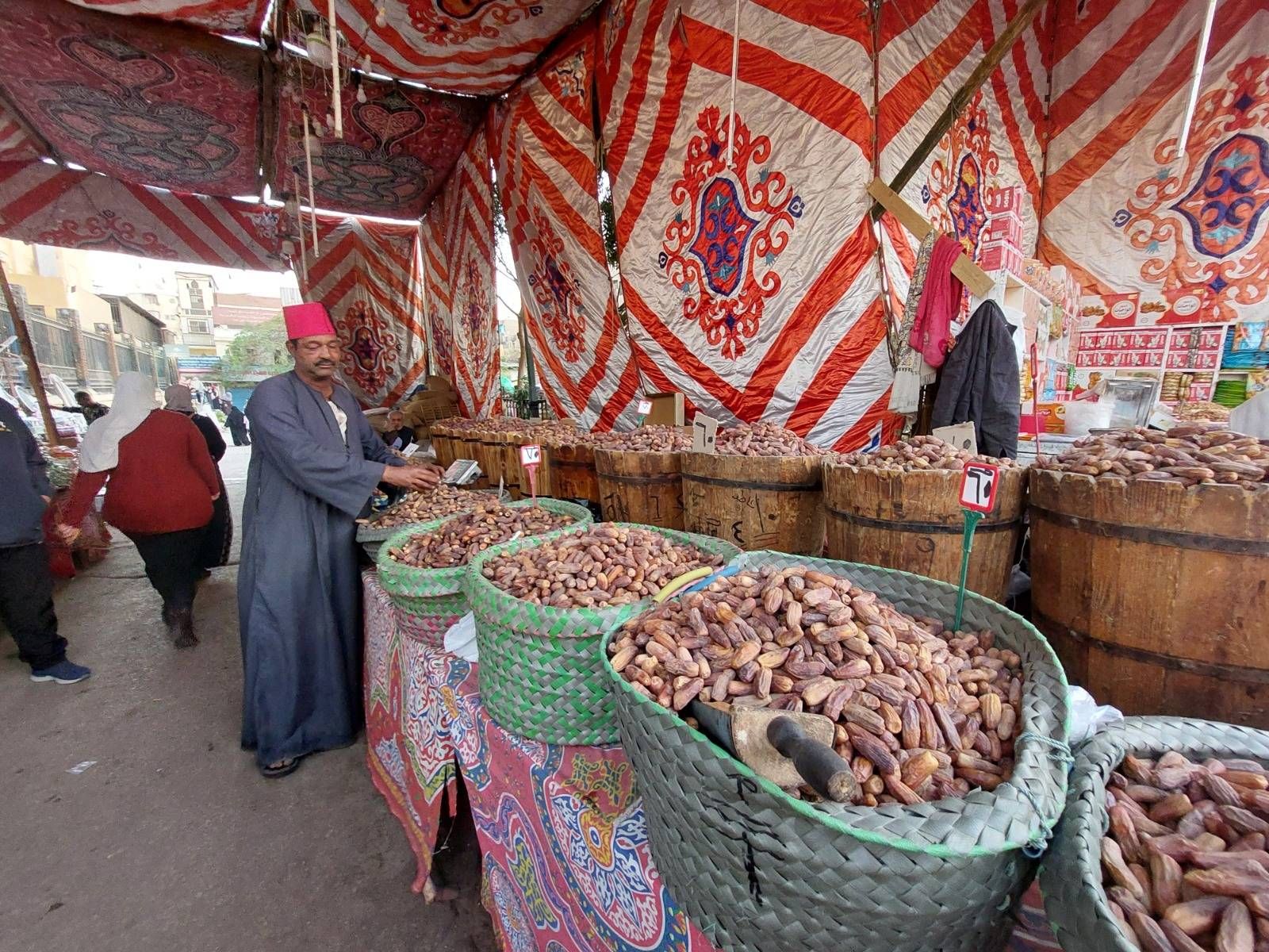 وفي حي «السيدة زينب» الشعبي، تعالى نداء تاجر البلح الستيني سمير الخطيب مردداً: «يا مسكّر يا بلح». وبينما كان يستقبل زبائنه مرتدياً طربوشاً أحمر، راح العمال لديه يصفقون على أنغام الأغاني الرمضانية التراثية الشهيرة المنبعثة من مكبرات الصوت القريبة، في محاولة للفت أنظار الزبائن إلى بضاعتهم.
