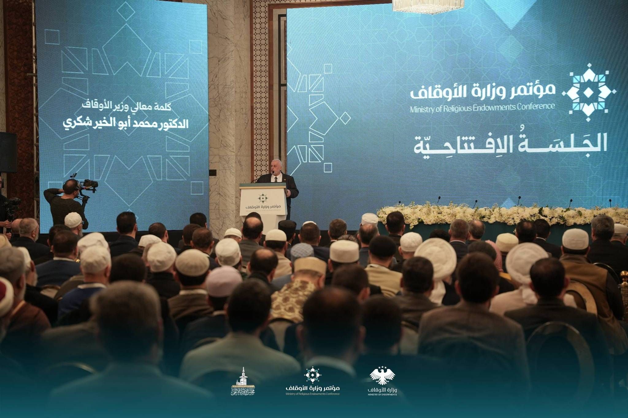 بمشاركة أكثر من مائة وخمسين عالم دين وداعية في سوريا، عقدت وزارة الأوقاف مؤتمرها الأول «وحدة الخطاب الإسلامي» على مدى يومي الأحد والاثنين. وشارك الرئيس أحمد الشرع، اليوم، في المؤتمر الذي عقد في قصر المؤتمرات بدمشق.