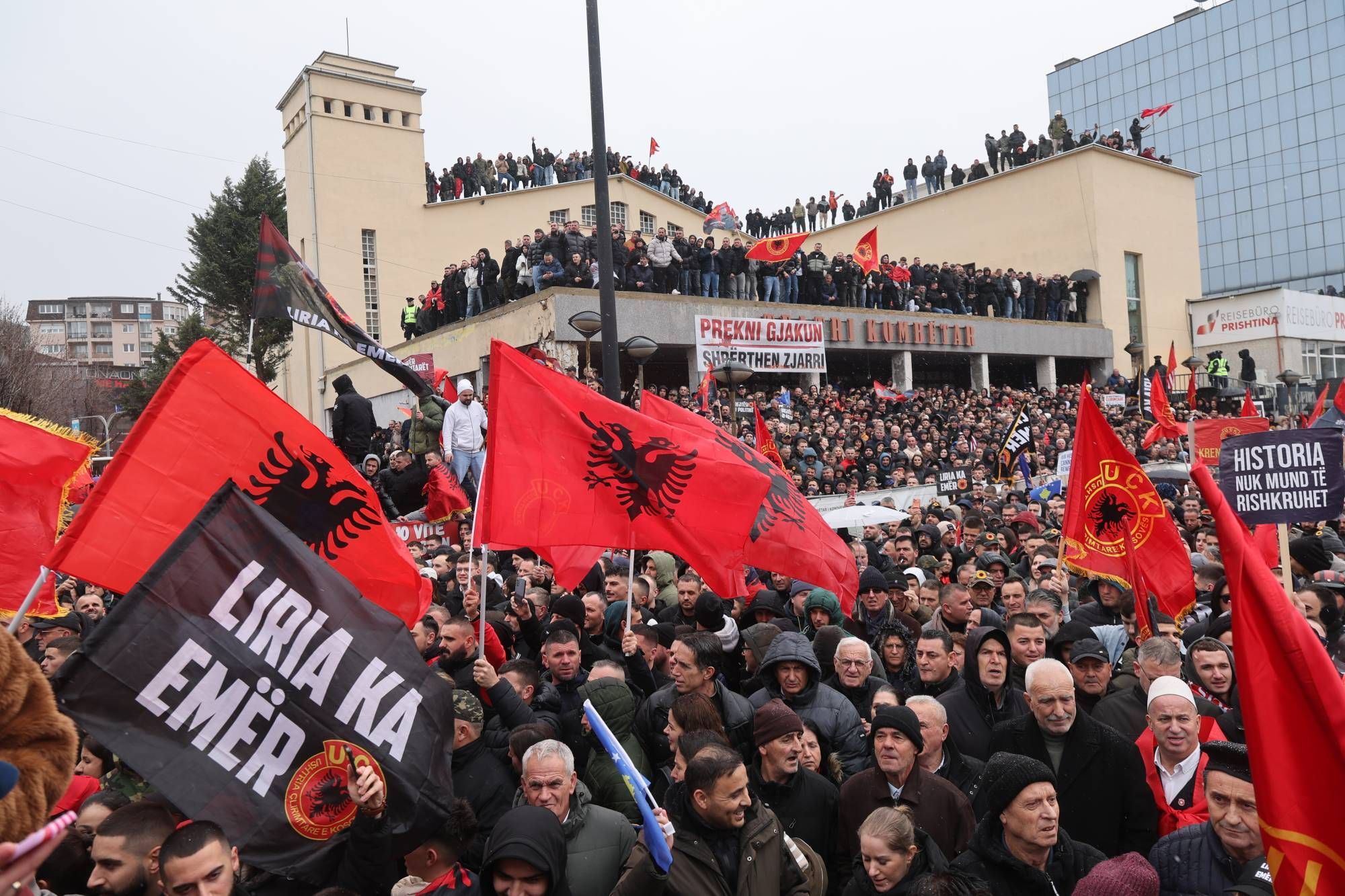 تجمّع الآلاف في بريشتينا، الثلاثاء، حاملين لافتات جيش تحرير كوسوفو للاحتجاج على محاكمة قادة الجيش السابقين، ومنهم رئيس سابق، بتهم ارتكاب جرائم حرب خلال حرب الاستقلال التي اندلعت في كوسوفو بين عامي 1998 - 1999.